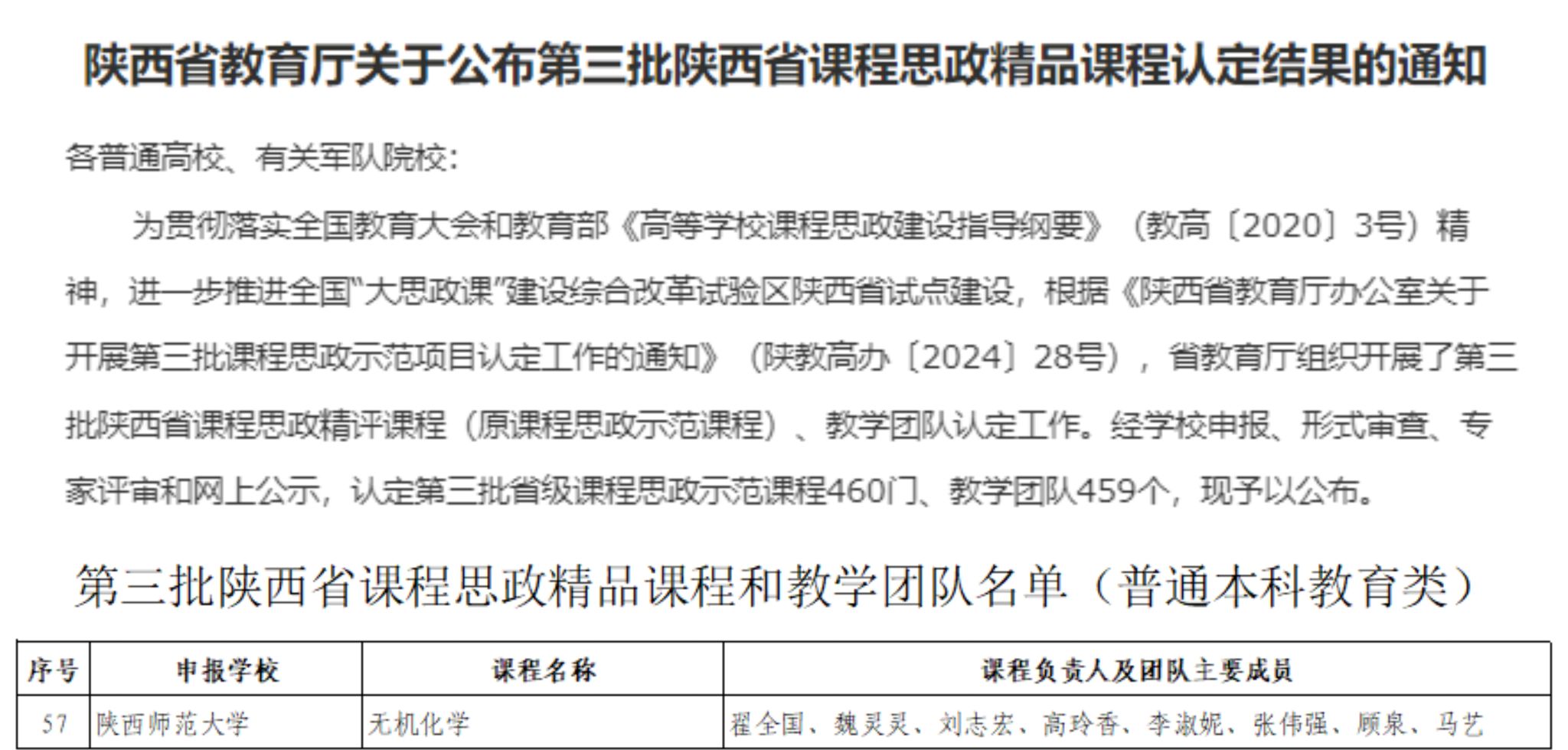 翟全国教授主持的《无机化学》课程成功入选,该课程教学团队同时被认定为陕西省课程思政教学团队。