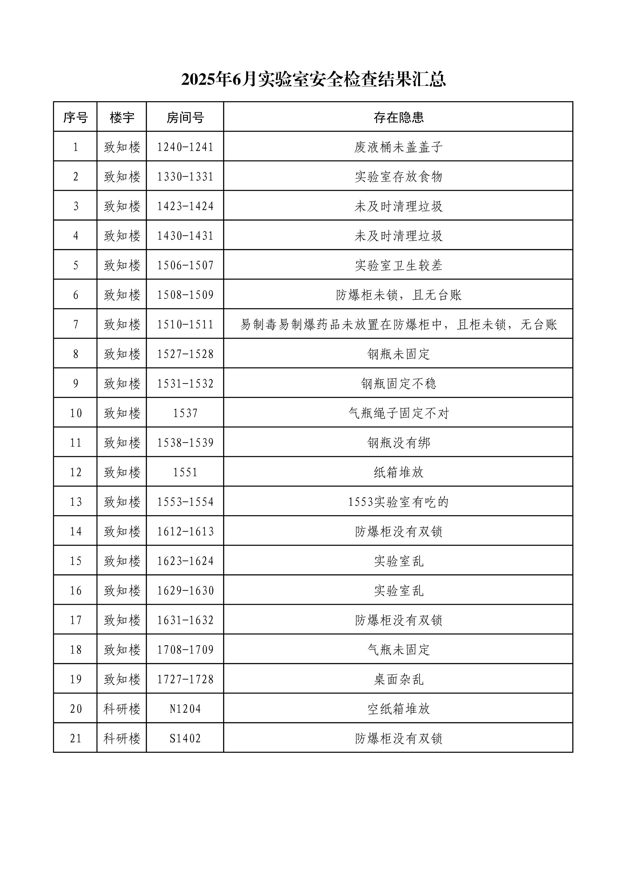 经检查发现,本次安全检查整体情况较好,但仍存在一些安全隐患,主要包括个别实验室防爆柜使用不规范、实验室卫生较差等。