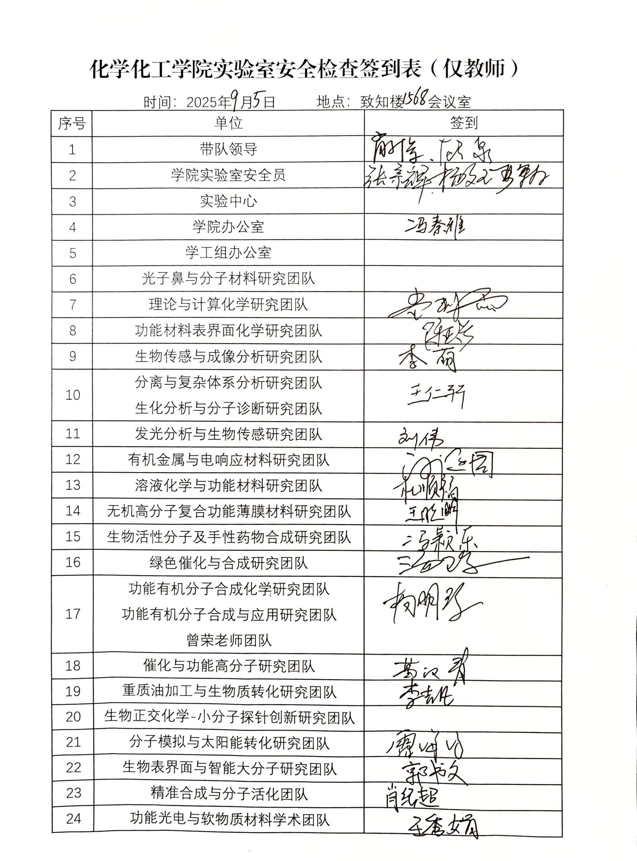 副院长肖新军、顾泉,应用表面与胶体化学教育部重点实验室副主任严军林,安全工作委员会副主任杨文玉,各科研团队教师代表和学生代表等40余人参与本次安全检查工作。