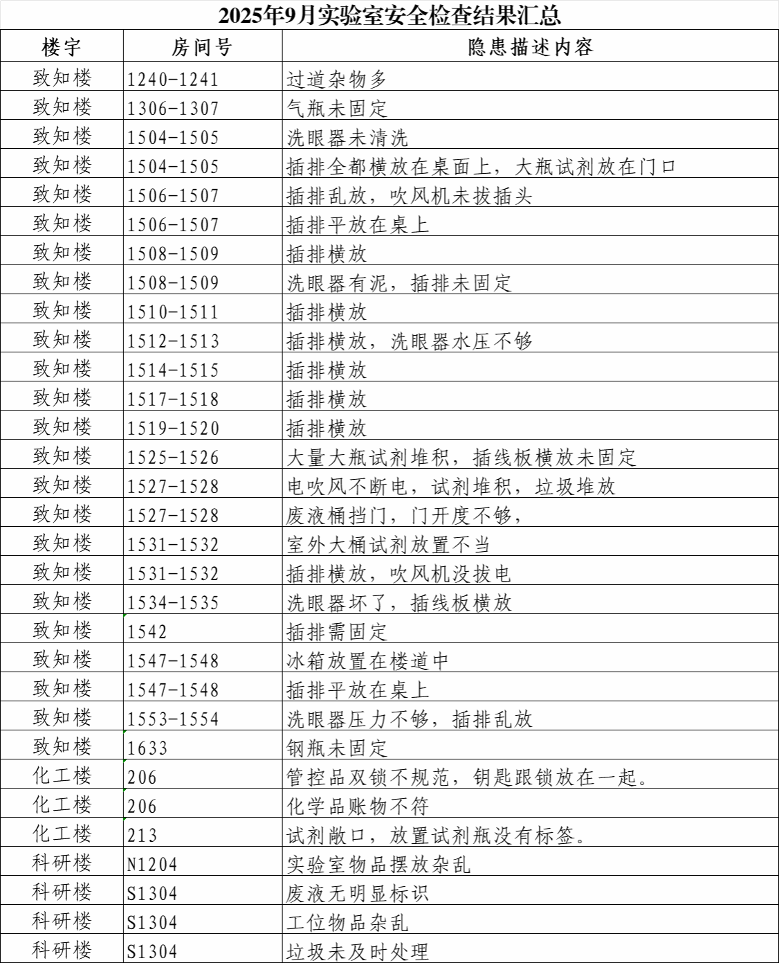 排查出需重点关注的问题开展,一是化学品管理不规范,部分实验室存在危险化学品账物不符的问题;二是消防管理存在短板,消防相关规范落实不到位,杂物堆放堵塞消防设备的问题。