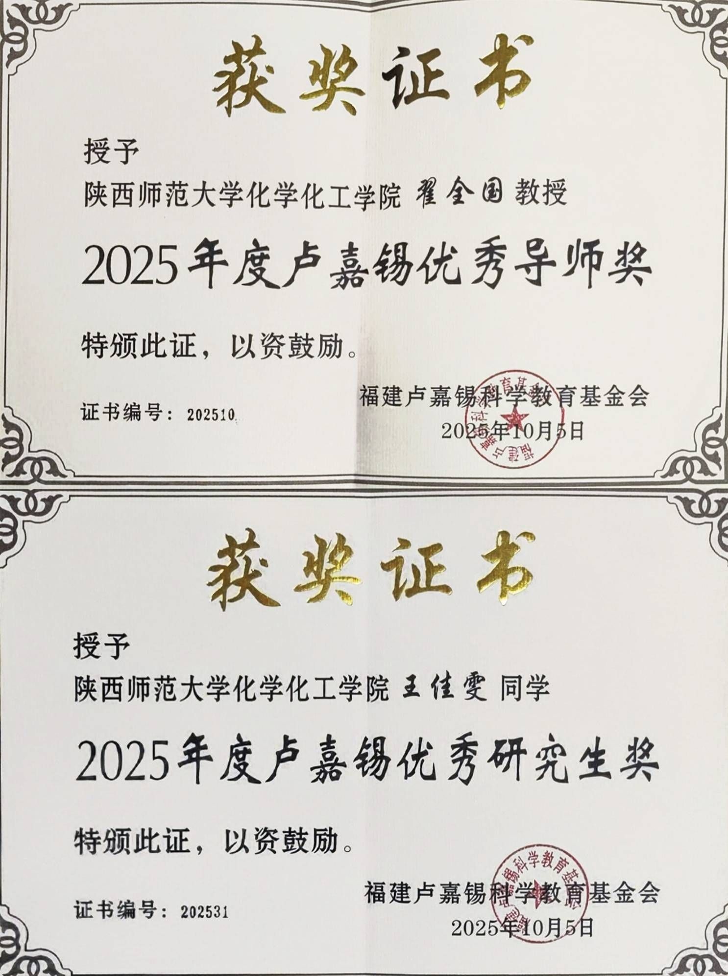 近日,经福建卢嘉锡科学教育基金会评审,拉斯维加斯娱乐城官网 翟全国教授获得2025年度卢嘉锡优秀导师奖、2023级博士研究生王佳雯获得2025年度卢嘉锡优秀研究生奖。