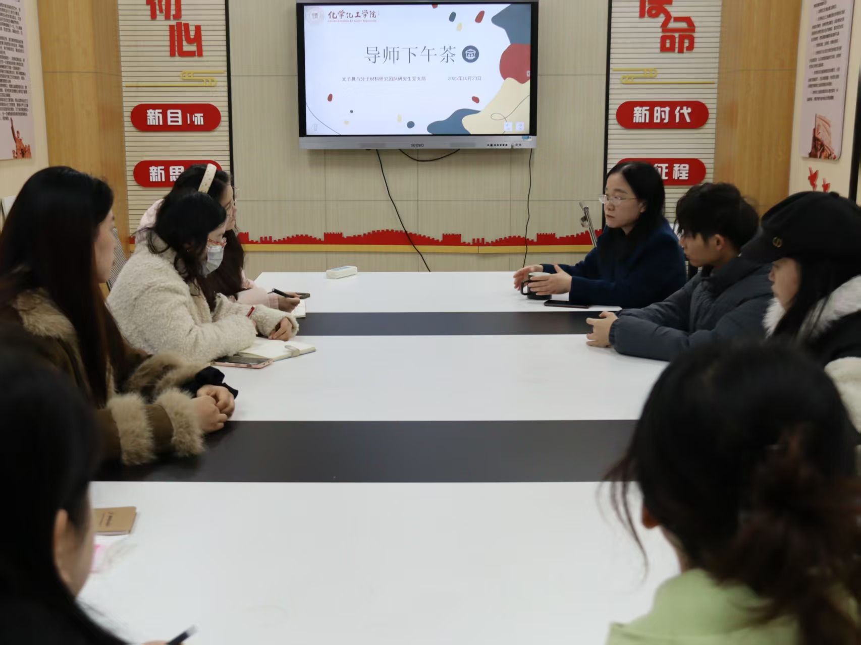 10月23日,第12期“导师下午茶”活动于致知楼1347顺利开展。本次活动由光子鼻与分子材料研究团队研究生党支部承办,丁立平教授应邀参加。针对新生课题起步,丁立平教授强调,同学们需紧扣课题组核心研究方向,系统梳理学科研究脉络,通过深度研读文献、积极参与实验和认真准备组会汇报,夯实科研基础。谈及职业规划,她鼓励同学们充分挖掘自身求职优势,打破地域与编制的思维局限,勇于承担科研工作者的社会责任,以积极心态应对成长焦虑。在交流互动环节,师生围绕课题推进难点与职业选择困惑展开深入对话,丁立平教授结合学科发展规律和自身实践经验,为同学们提供了针对性建议。