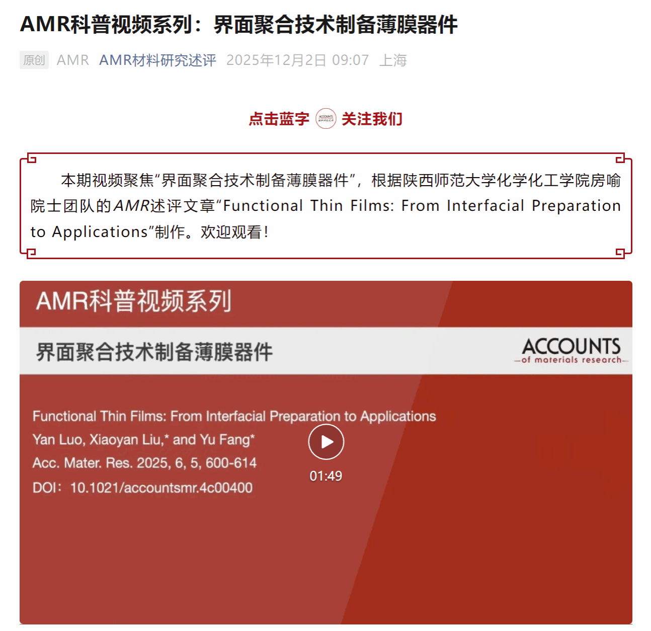 近日,Accounts of Materials Research根据拉斯维加斯娱乐城官网 房喻院士团队的AMR述评文章“Functional Thin Films: From Interfacial Preparation to Applications”制作了一条科普视频《界面聚合技术制备薄膜器件》,并在微信公众号“AMR材料研究述评”上发布。