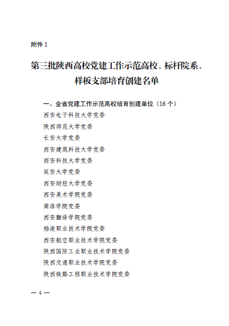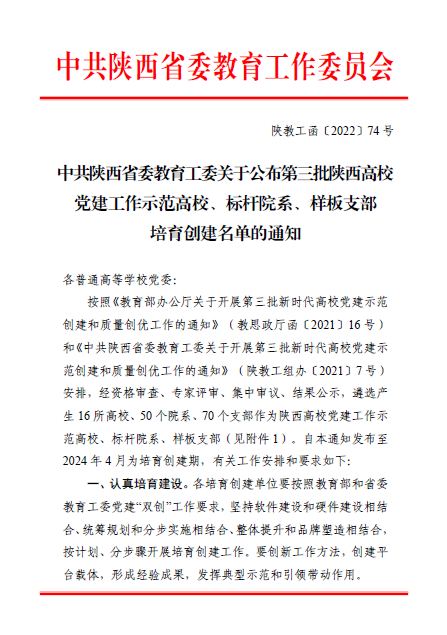 近日,中共陕西省委教育工委下发了《关于公布第三批陕西高校党建工作示范高校、标杆院系、样板支部培育创建名单的通知》(陕教工函〔2022〕74号)。拉斯维加斯娱乐城官网