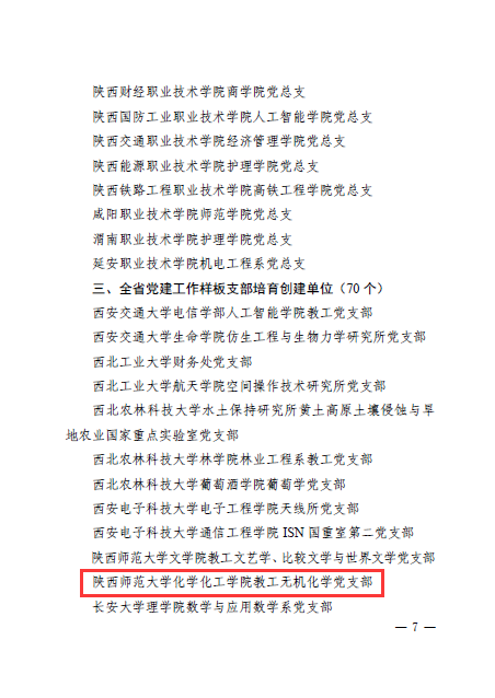 党委获批全省党建工作标杆院系培育创建单位、教工无机化学党支部获批全省党建工作样板支部培育创建单位。
