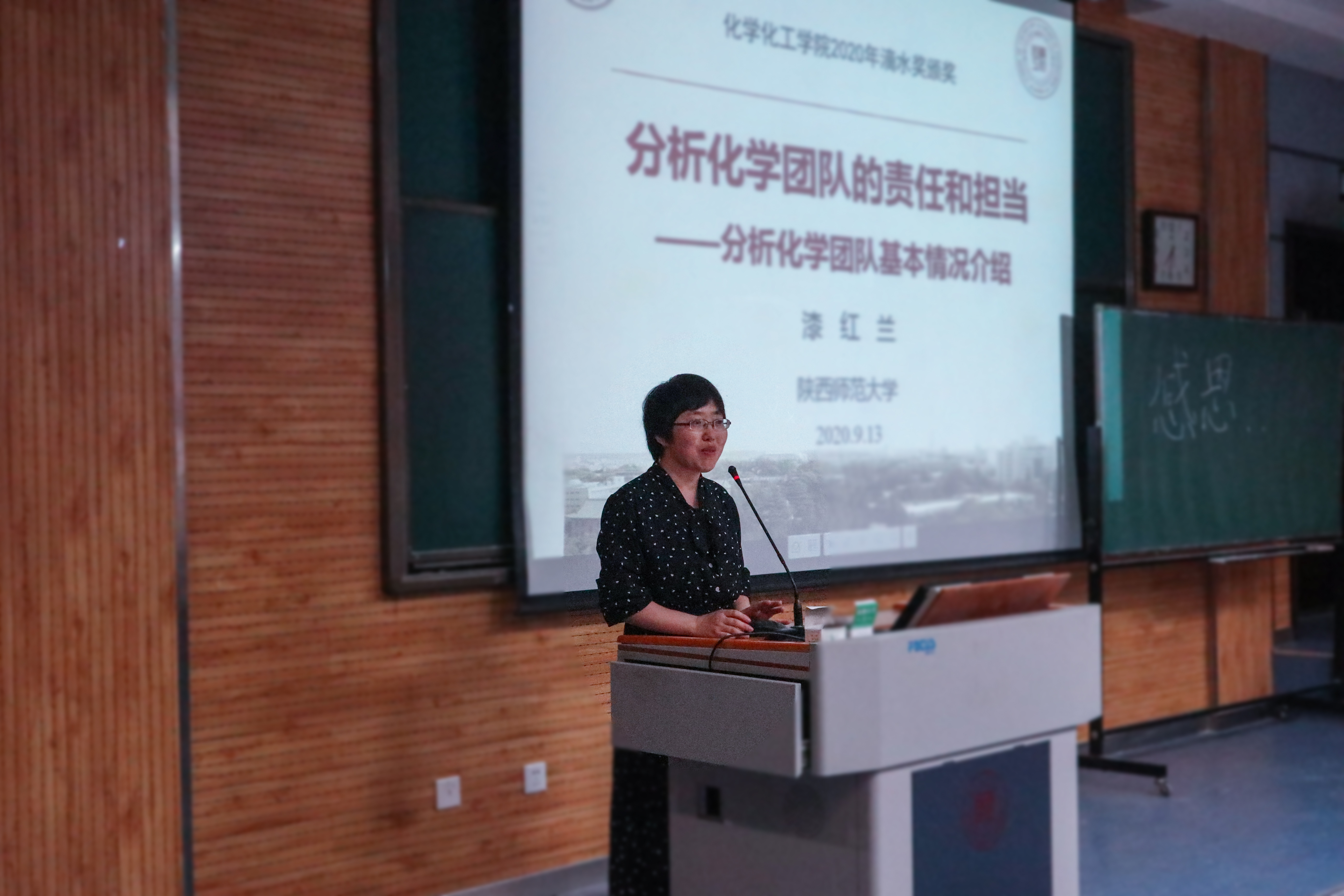 漆红兰老师以“分析化学团队的责任与担当”为题,从分析化学的学科背景、教学团队、科研团队及重点实验室四个方面,全面地介绍了分析化学团队的历史沿革和学科发展走向,并表示将坚定不移地传承老一辈教育者孜孜不倦、追求真理的工匠精神,努力践行为党育人、为国育才的初心使命。获奖学生代表白丽娟发表感言,她表达了对拉斯维加斯娱乐城官网