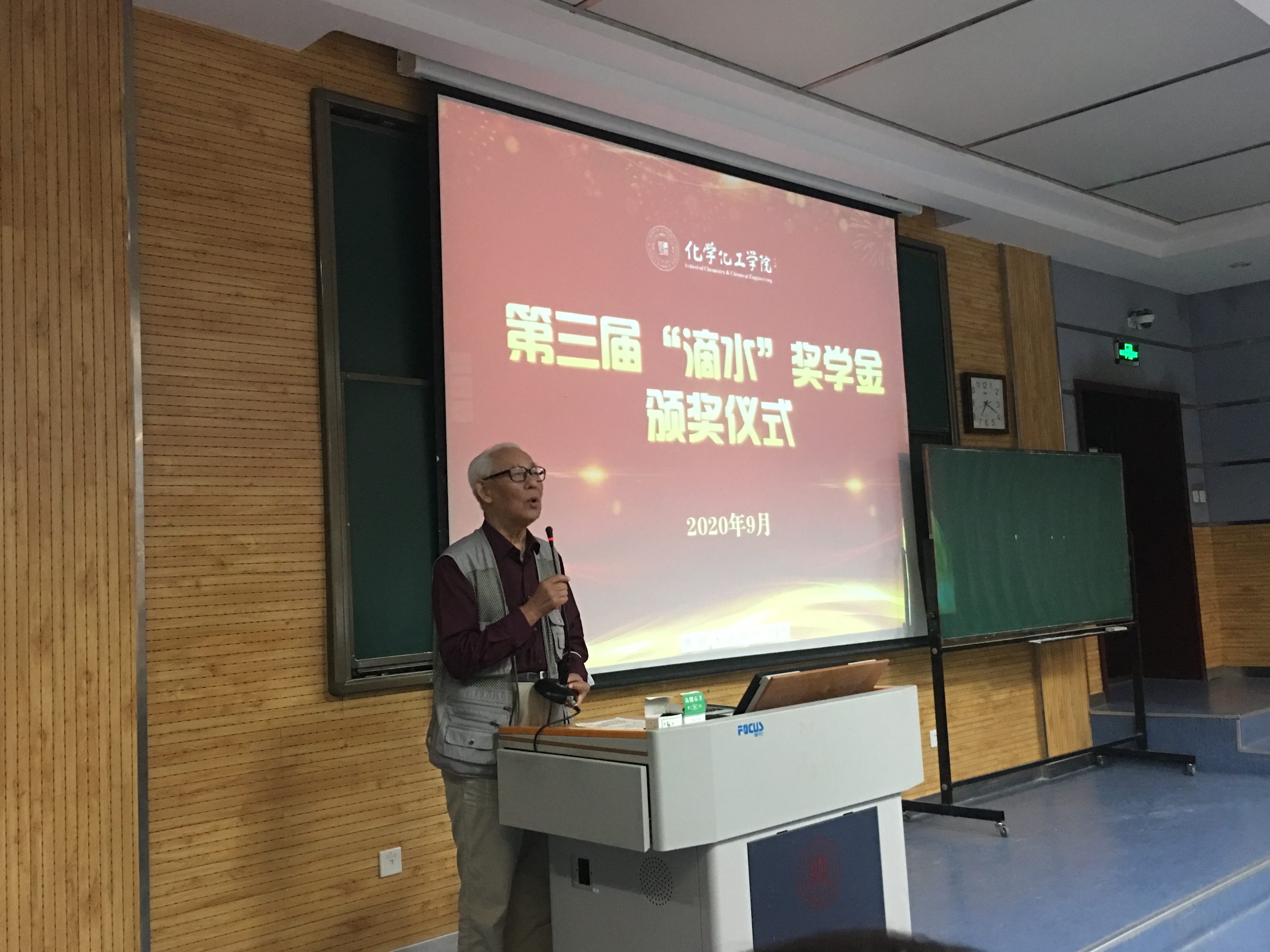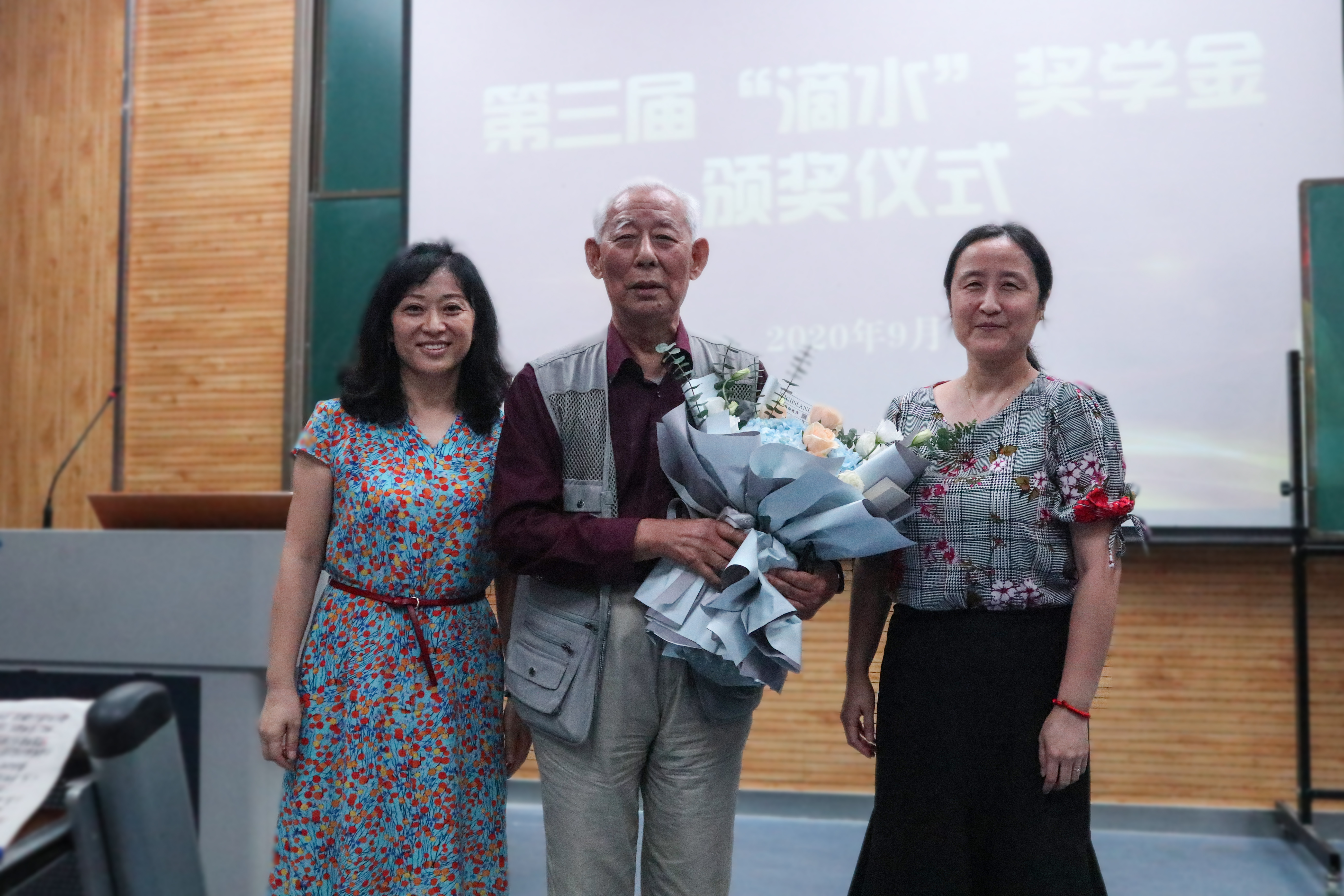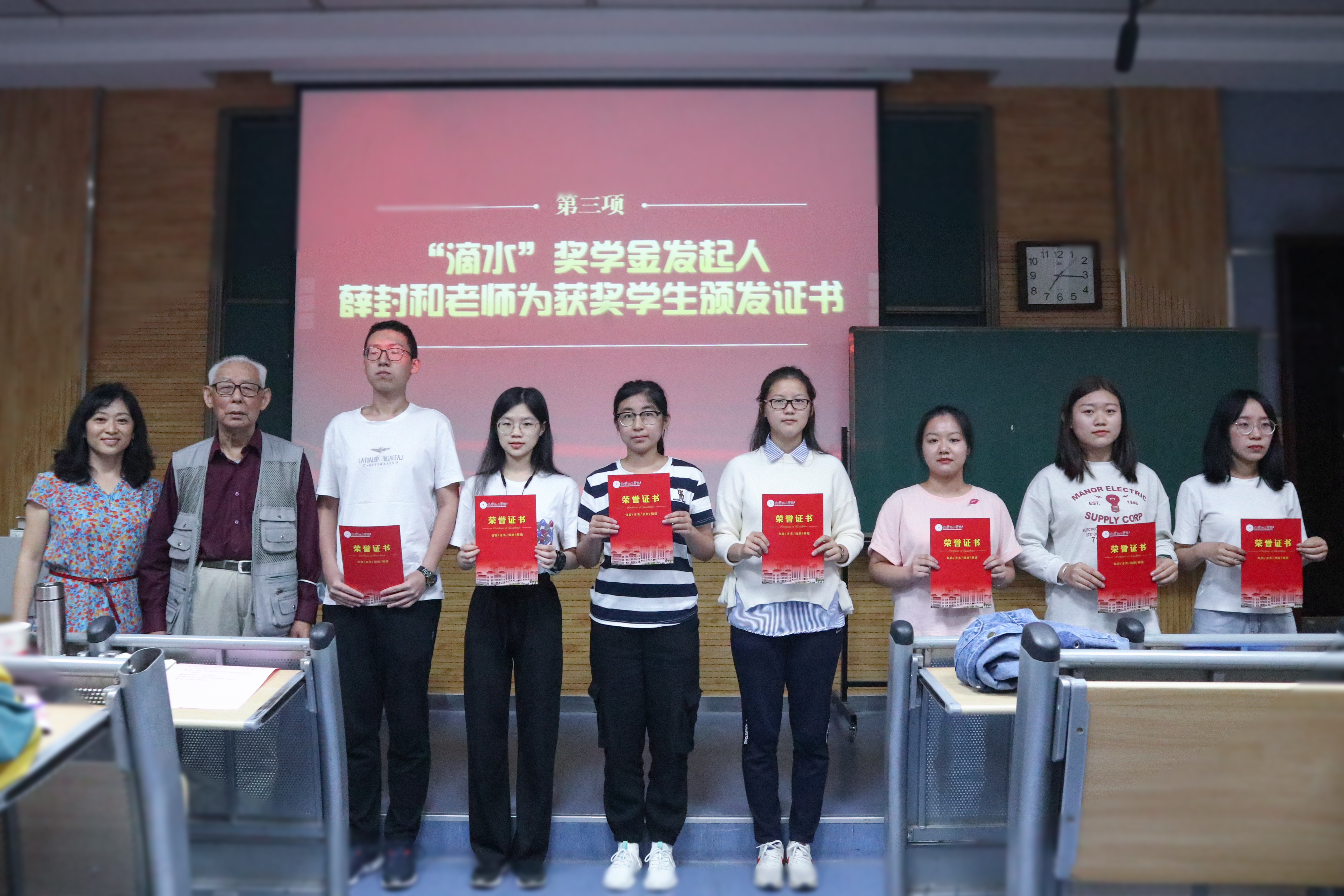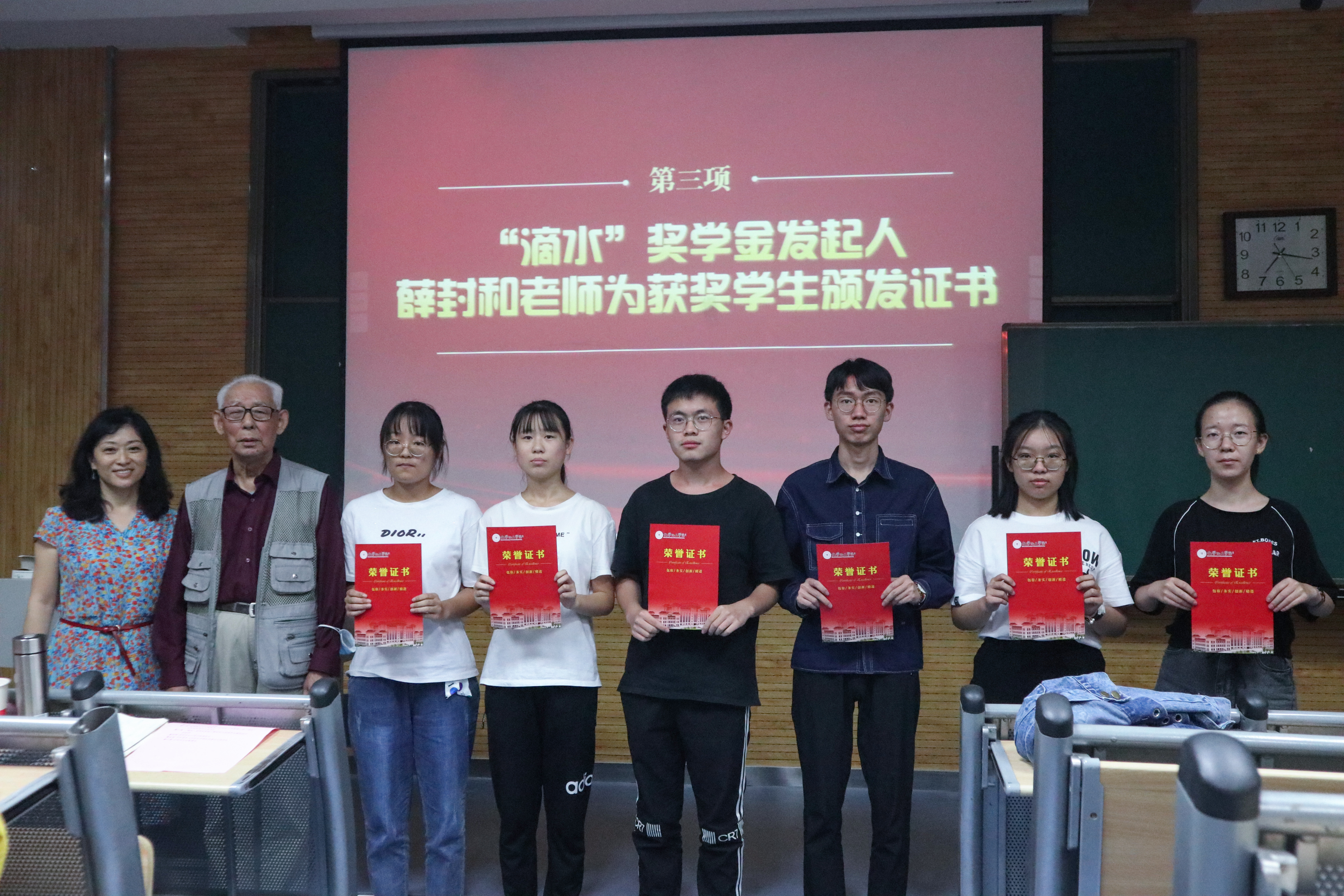 发展历史与学科队伍建设历程,介绍了“滴水”奖学金的发起缘由与评选办法。薛封和老师为13名获奖学生颁发荣誉证书并讲话,他用亲切的话语分享个人亲身经历与多年教学心得,在黑板上郑重地写下了“感恩”二字,以此向同学们提出期许,一是要不忘历史、牢记党恩,尤其是在举国同心对抗疫情的战斗中感受中国制度优势,坚定爱国主义信念,勇敢肩负起时代发展和民族复兴的大任;二是要牢记身份、坚守传统,坚定文化自信,做中华优秀传统文化的忠实传承者和弘扬者;三是要不忘初心,锤炼本领,不断扎实学识与技能,让梦想在砥砺中前行。刘伟老师代表全体师生向薛封和老师献花,致以诚挚敬意和衷心感谢。