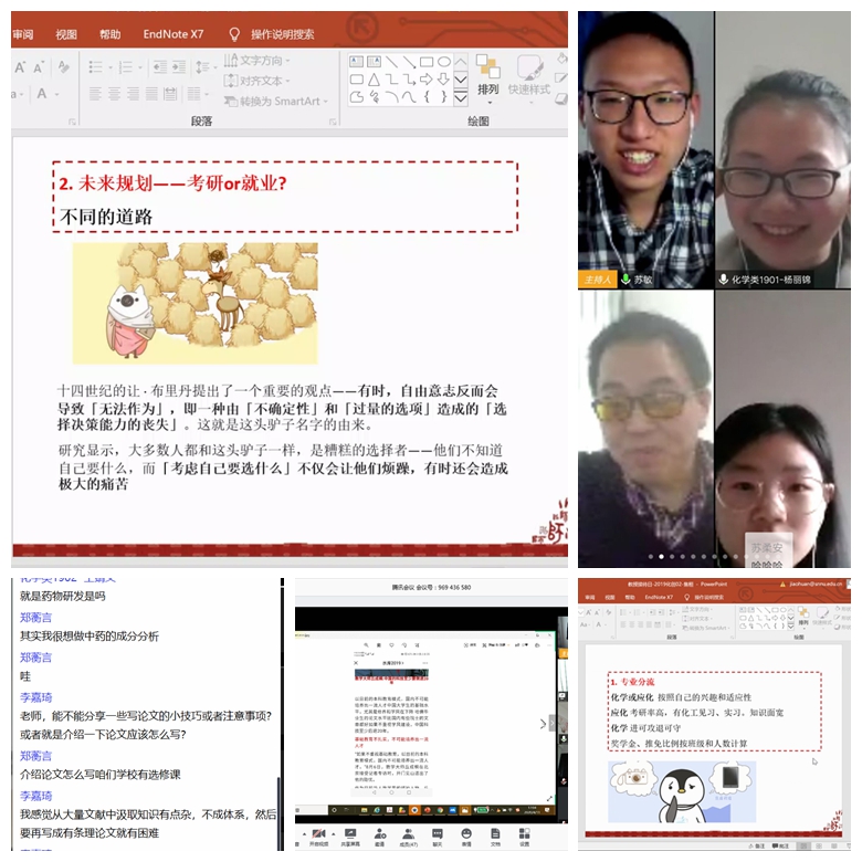 4月11日,化学类1901班邀请岳宣峰副教授开展活动,岳教授通过摄像头热情亲切地与同学们打招呼,以一段流利的英文开场白活跃现场气氛。针对同学们即将面临的专业分流,岳教授结合社会发展现状分析专业就业前景,鼓励同学们褪去学习“功利化”,反躬自省、当思勤勉,针对非师范生的未来发展叮嘱同学们充实自身,才能拥有更多选择。