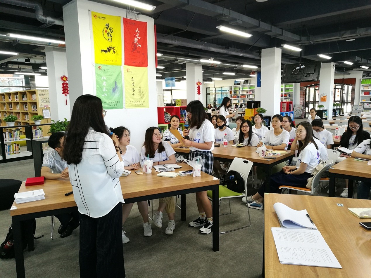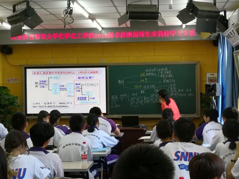 见习活动中,化学卓越班的同学们观摩了清华附中高中化学任课老师赵玥老师的《再识工业流程》化学示范课。她首先引导学生建立起工业流程图以从原料到产品为主线、以原理和操作为辅线的模型,而后组织小组讨论让学生运用此模型设计提取氧化镁的工业流程图,而后学生展示讨论结果,教师引导全班同学完善补充,充分调动了全体学生思维的积极性,有效完成了课程目标,课后赵老师和我们交流时说她的这堂课充分体现了“证据推理与模型认知”的化学学科核心素养,学生通过自己推导并设计工业流程图,不仅可以全面地掌握本节课的内容框架,也有利于学生对元素化合物知识的运用和迁移。由此可见建立模型讲授思维对于课堂教学的重要性,如今的课堂教学早已超乎知识的讲授,更多的是思维的锻炼和模型的建构,让学生的知识成体系并运用于探索未知。课后,同学们与授课老师就课程设计及教学思路进行了充分的研讨与交流,赵玥老师回答了同学们的问题,并给出了关于初为教师注意的问题及建议。