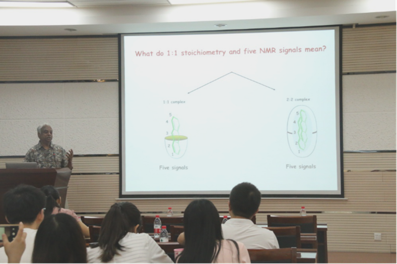 报告中,V. Ramamurthy教授围绕反应介质在光化学过程中的重要作用,分别介绍了激发态分子在限域空间中的动力学过程和以多种主客体作用为反应介质的超分子光化学。主要包括:(1)激发态分子在限域空间中的动力学过程表征方法及其研究机理;(2)以超分子主体为反应介质、以待研究分子为超分子客体时,目标分子的光化学行为。