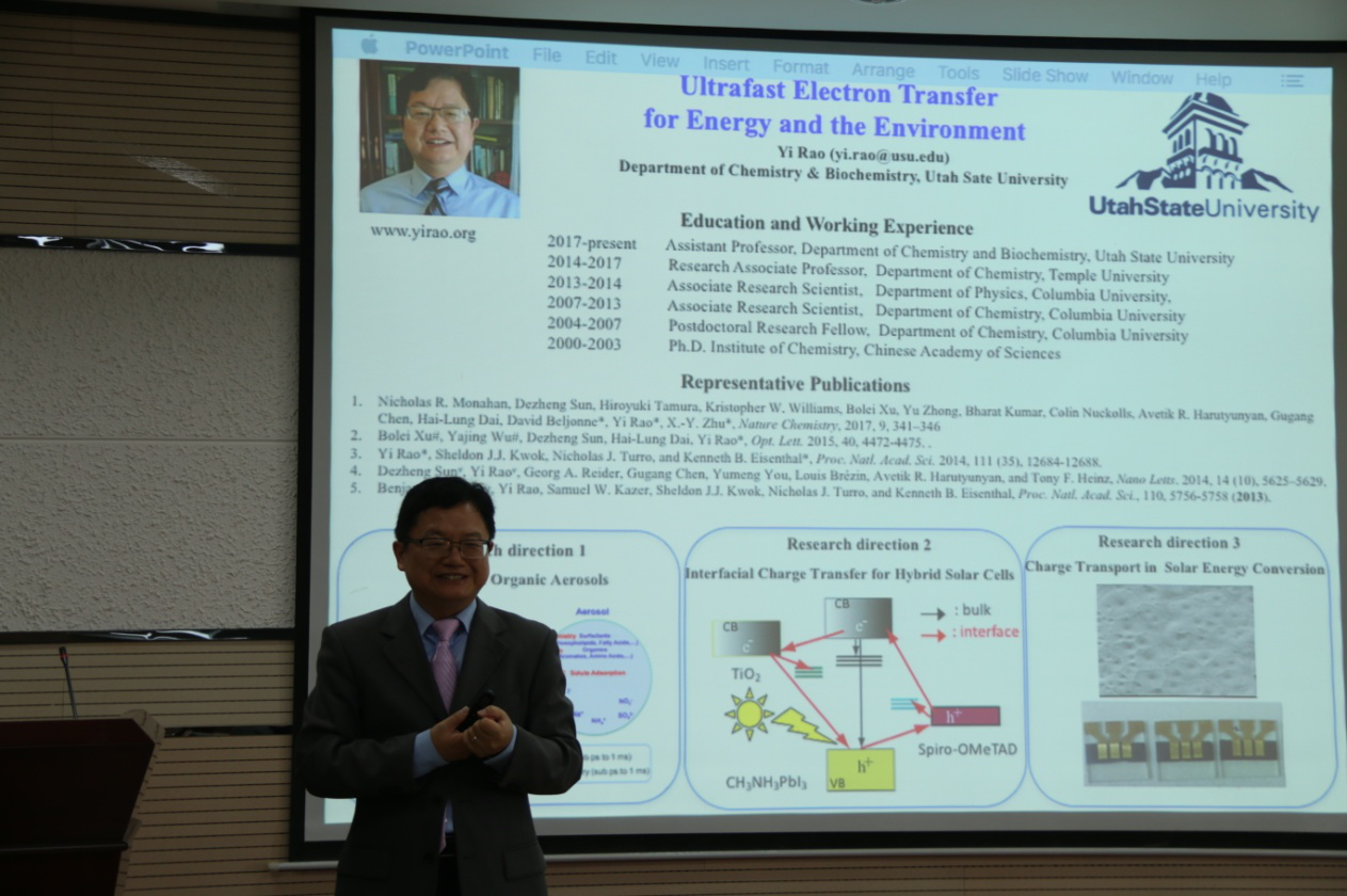 报告前,边红涛教授首先对Yi Rao教授的个人信息和科研经历做了简单介绍。报告中,Yi Rao教授首先简单介绍了犹他州立大学的情况,以及招生意愿。然后详细介绍了他在界面反应和电荷转移方向的相关工作。接下来又对Anisotropic Singlet Fission in Organic Semiconductor 和 Transient Absorption Spectroscopy进行了详细报告。