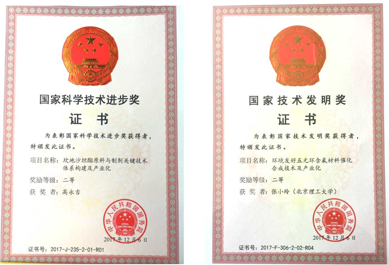 副院长张小玲作为项目“环境友好五元环含氟材料催化合成技术及产业化”主要参与人荣获国家技术发明奖二等奖。