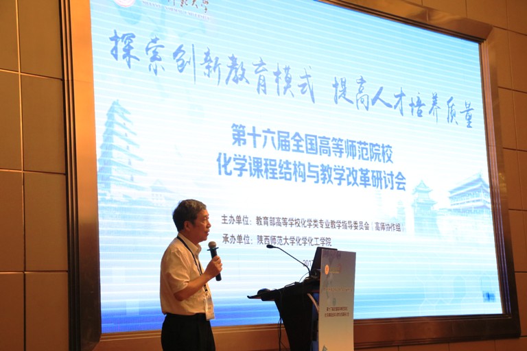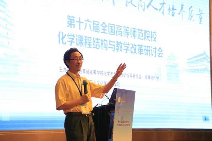 长陆靖教授作了题为“教在大学”的报告。下半场的两场大会报告由拉斯维加斯娱乐城官网前任校长房喻教授主持,北京师范大学欧阳津教授作了题为“高师本科分析化学课程建设与人才培养”的报告, 浙江大学彭笑刚教授作了题为“物理化学与实验事实”的报告。