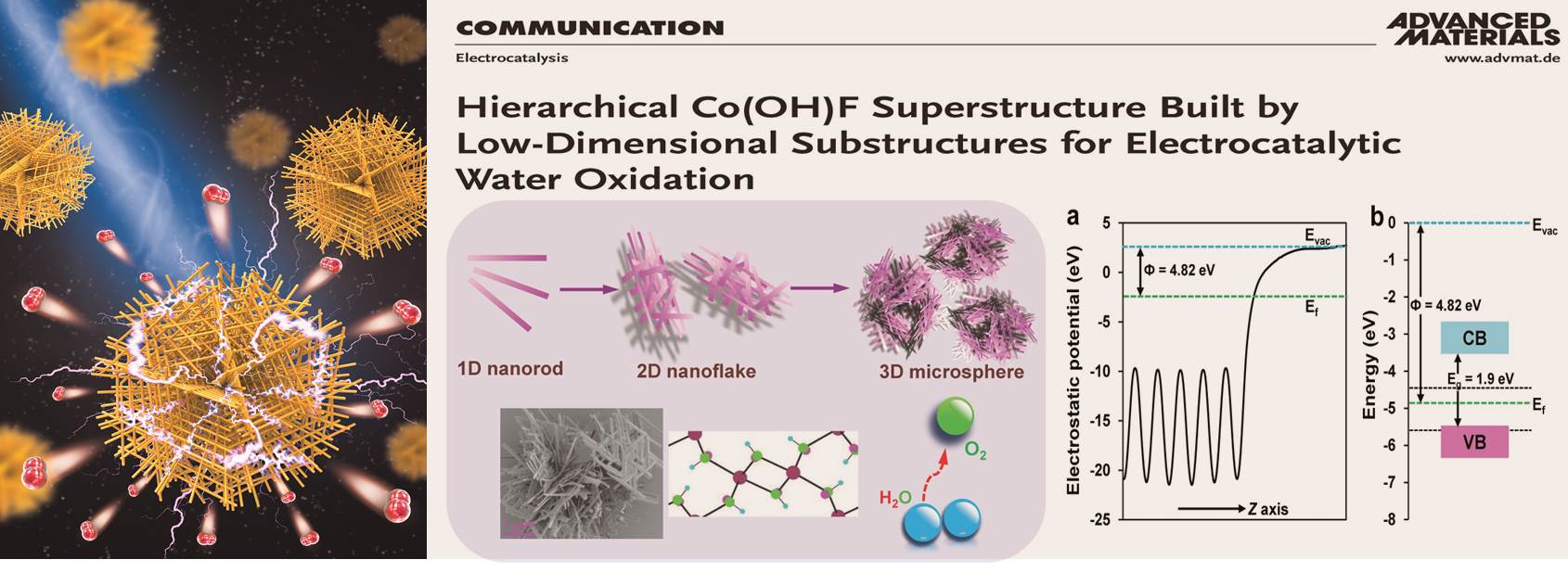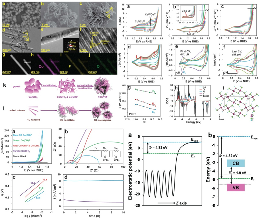 基于前期的系列结果,团队研究人员在开发用于电催化水氧化的新材料与新结构方面进行了大量尝试,并于近期成功合成了新颖的Co(OH)F多级结构材料。该材料是一种新奇的多级组装体系。其基本结构单元为单晶纳米棒,其次级结构为由纳米棒编织而成的多孔纳米片层结构,其高级结构为由纳米片层结构搭建而成的独立微球聚集体超级结构。这种新颖的材料组装形式导致最终结构中同时包含了一维、二维和三维材料特性,这些多维特性在催化过程中均起到明显的积极作用。一维基本单元的各向异性特性带来快速的电荷转移能力、高比例的低能晶面和超高表面积体积比率;一维结构编织的二维单元带来催化过程中快速的传质与传荷;三维超级结构的高孔隙率可以极大提升底物扩散效率。同时,Co(OH)F也是首次被报导为电催化水氧化催化剂。惰性氟配体的引入不仅形成了新颖的组装结构并很好的稳定了催化剂表面结构。电化学及理论计算表明在催化水氧化前表面二价钴被逐步氧化成高价态活性钴中心。该论文的第一作者为拉斯维加斯娱乐城官网