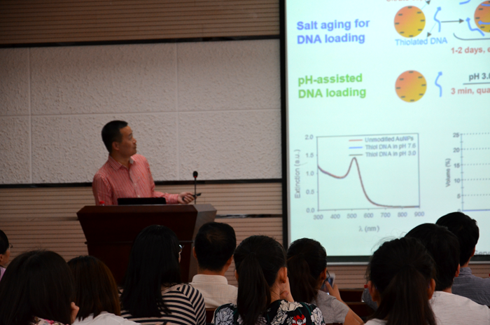 此次报告中,刘珏文副教授首先对加拿大滑铁卢大学进行了简要介绍,并对其研究工作做了概述,随后详细介绍了基于金属氧化物纳米粒子与DNA相互作用的多种传感新体系的建立,以及DNA和金纳米颗粒间相互作用的进展。最后刘珏文副教授还介绍了金属特异性DNA酶的筛选及在金属离子检测方面的应用研究工作。