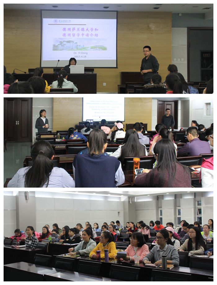 历史、师资力量、硬件设备、机构设置等情况,让同学们对萨兰德大学有了基本的了解。同时,董教授对同学们关心的留学问题也作了详细地说明。其次,董教授介绍了德国大学的课程设计情况,介绍了德国大学本科及硕士的课程概况,以及课程的学分设置,特别说明了德国课程成绩通常分为口试、考试、报告三部分。对比中国的教育,她认为德国的教育在重视基础知识的同时,注重研究性学习以及学生对知识的运用能力培养。报告之后,董教授就学生感兴趣的问题做了解释和说明,并与同学们互动交流。活动最后,尹教授表达了与德国萨兰德大学进一步交流活动的殷切希望。