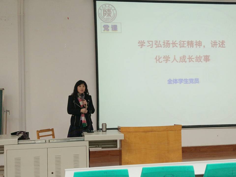 领导讲党课和支部党员集体讨论的方式进行学习。高玲香书记在教工教法应化高分子党支部和行政党支部的讲课主要围绕教书育人、师德师风建设及如何做一名党和人民满意的好老师与全体党员进行了讨论;李保新副院长主要围绕如何做好教师党员的本职工作与教工分析支部全体党员进行了深入探讨,鼓励大家一定要立足本职岗位,争创一流业绩;焦桓副院长在教工无机支部的学习讨论中提到:我们要筑牢从严治党的政治根基,不忘初心,继续前进,在新长征路上续写新篇章,再创新辉煌;肖新军副院长主要从如何做一名有作为、会作为的实验技术管理干部与实验中心支部与会党员进行了探讨,希望大家认清目前面临的问题,明确今后的努力方向;薛东院长以“如何成为一名合格的研究生导师”为题与教工有机支部全体党员进行了交流学习,他提到:德才兼备、具有强烈责任感是我们努力的方向,只有这样我们才能成为研究生的科研“导航人”;王晓副书记在教工行政支部的讲课中提到:我们要有觉悟,坚定理想信念,提升精神境界,不断提高自身为人民服务的本领;丁立平副院长与教工物化支部全体党员探讨中提到:广大教师一定要以学促做,树立终身学习理念,努力让自己成为师德高尚、业务精湛、充满活力的高素质的专业化教师。各支部与会同志纷纷表示,我们要弘扬伟大长征精神,坚定“四个自信”,继续在实现“两个一百年”奋斗目标、实现中华民族伟大复兴中国梦的新长征路上万众一心、奋勇前进。