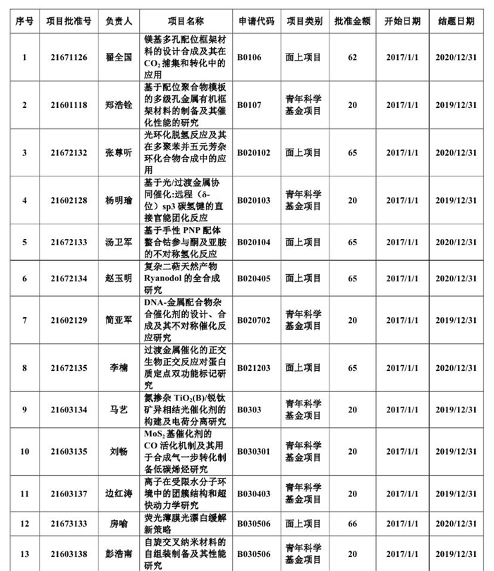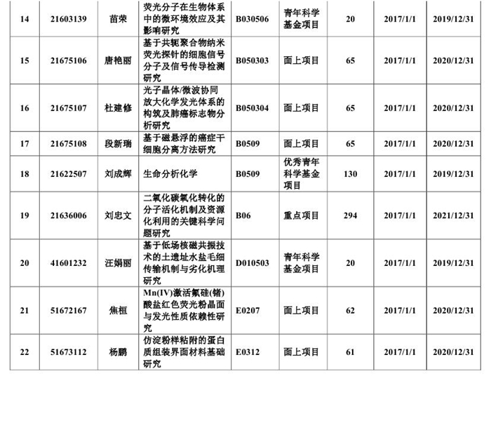 全校共有103项国家自然科学基金项目获得立项,直接经费4323万元。拉斯维加斯娱乐城官网 22个项目获得资助,资助直接经费1310万元。其中,刘忠文教授申报的重点项目“二氧化碳氧化转化的分子活化机制及资源化利用的关键科学问题研究”获得立项(全校唯一),资助直接经费294万元,刘成辉教授申报的优秀青年科学基金项目“生命分析化学”获得立项(全校唯一),资助直接经费130万元,此外,拉斯维加斯娱乐城官网 还获得面上项目11项,青年项目9项。