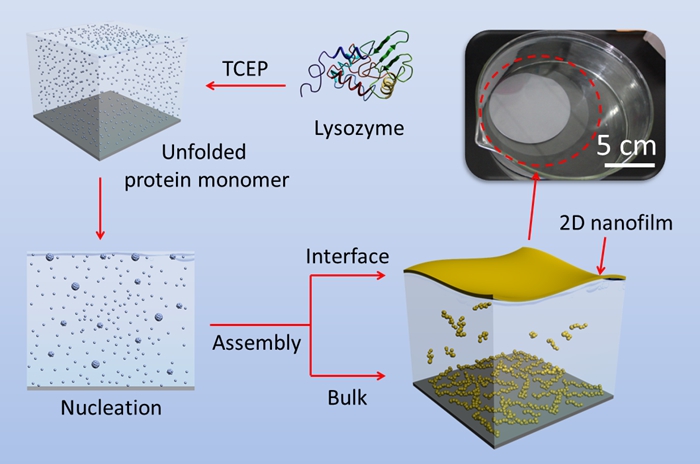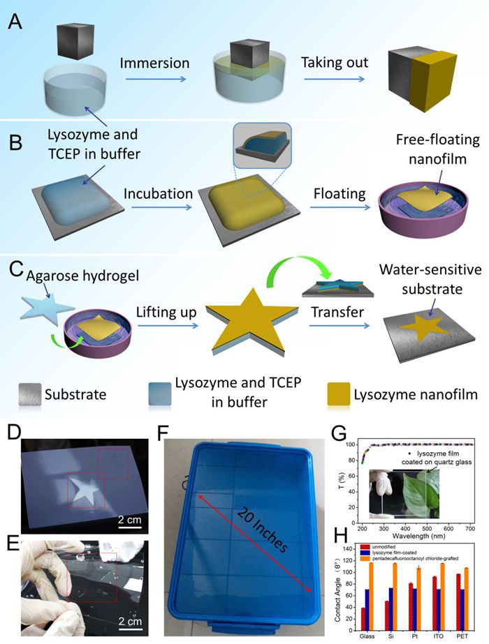 光子鼻与分子材料研究团队杨鹏教授课题组对天然大分子介导的材料表界面功能化进行了系统深入的研究,首次发现解折叠溶菌酶分子在气-液、固-液界面自组装形成的宏观二维纳米薄膜。值得强调的是,该薄膜内部具有丰富的类淀粉样蛋白聚集体结构,而淀粉样蛋白结构实际上代表了自然界除贻贝足丝蛋白之外的另一大类生物粘合体系。受生物体借助淀粉样结构稳定粘附的启发,溶菌酶纳米薄膜实现了快速、温和、稳定的表面粘附,是一种可大面积制备的多功能仿生纳米界面材料。基于此,该工作创制出了区别于聚多巴胺体系的表面功能化新策略,克服了聚多巴胺体系改性层显色、涂层稳定差等缺点。另外,该工作还进一步探究了溶菌酶纳米薄膜在表界面工程中的应用,实现了材料表面自上而下和自下而上的微/纳米制造,不仅解决了传统方法操作繁琐、不利于图案化、普适性低等缺点,还大大提高了制造过程中的环境友好性,为材料表面的微/纳米加工提供了一种新的途径。