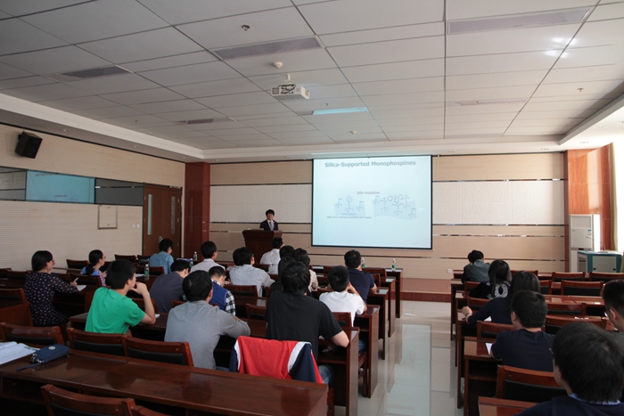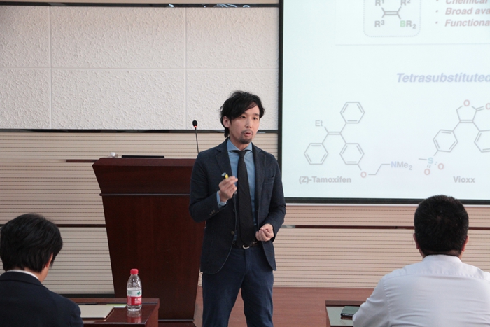 报告中,Ohmiya教授介绍了利用有机小分子三正丁基膦作为催化剂,实现不饱和炔键的单硼化,硅硼化以及双硼化的反应,高立体选择性的得到了反式加成的产物。同时将此方法成功运用到了天然产物(Z)-Tamoxifen的合成中。Sawamura教授介绍了新型膦配体在有机金属催化中的应用。通过双键的聚合反应将膦配体引入到高聚物中,同时又将过渡金属催化剂负载在高聚物中,此类催化剂表现出了非常好的催化活性,并成功的运用到了许多偶联反应中,同时催化剂还可回收重复使用。