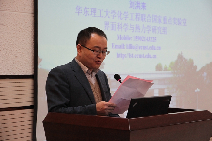 刘洪来教授从自己的团体开始介绍,与在座师生分享了团队的基本情况,尤其是团队的科研方向和目前的一些研究进展。接着,刘教授从两亲性胶体颗粒在研究中的重要意义开始,着重介绍了他们研究小组运用理论计算深入研究了多元聚合物在固体表面的溶剂效应,此外,还介绍了他们的理论计算成果成功地指导了催化剂表面改性的实验研究工作。刘教授巧妙地将深奥的理论计算研究讲得简单易懂,老师和学生都从中受益匪浅。之后,刘教授还与部分老师和学生进行了更加深入的学术交流。