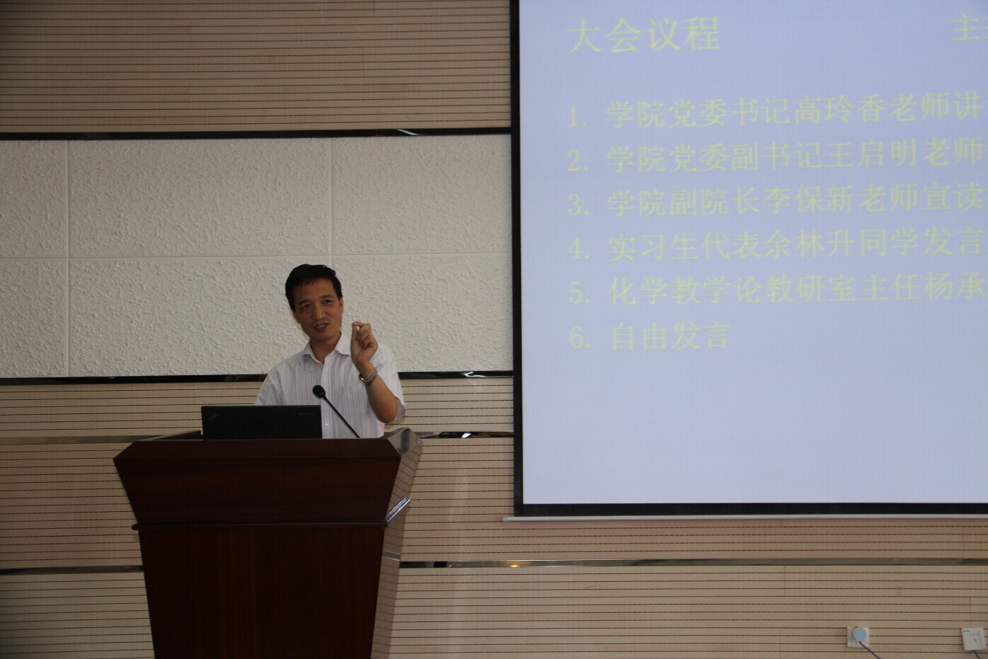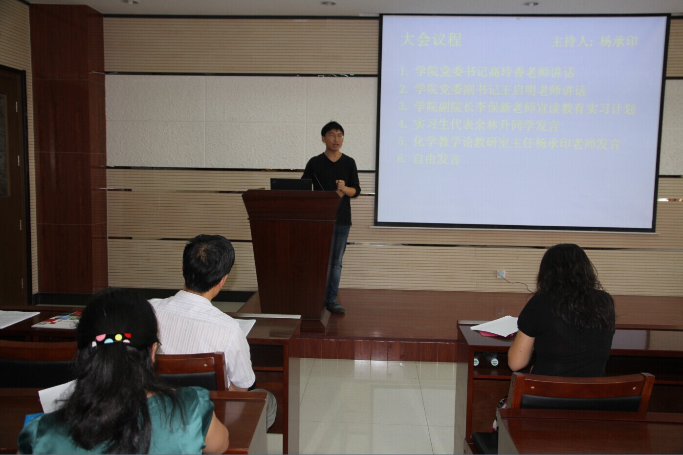 形象,言谈举止都要得体大方,王启明副书记要求全体学生实习期间严格遵守实习纪律,保证信息通常,保持联络。李保新副院长宣读了教育实习计划,同时对教育教学实习做了较为概括的介绍,指出教学实习环节是大学生教学技能培养的核心环节,作为大学生要具备扎实的教学基本功,提升知识深度和广度,要做到专业知识自信,保证所传授知识的科学性和准确性,希望同学要勤于虚心向指导老师请教。随后,2011级化学2班余林升同学代表本级实习同学发言,号召同学们勇于担当,以教育为己任,团结奋进,不辱使命,完成教育教学实习,以优异的成绩来回报母校的培养和实习地师生的信任。最后杨承印老师结合实习中具体事例,详细讲解了实习工作中的重要问题:重视安全问题,以教育教学实习为核心人物,人际关系从简,加强与实习基地老师的沟通,重视教育调查报告,注重教学反思。通过本次动员大会,使2011级实习生更加明确了实习的要求和方向。