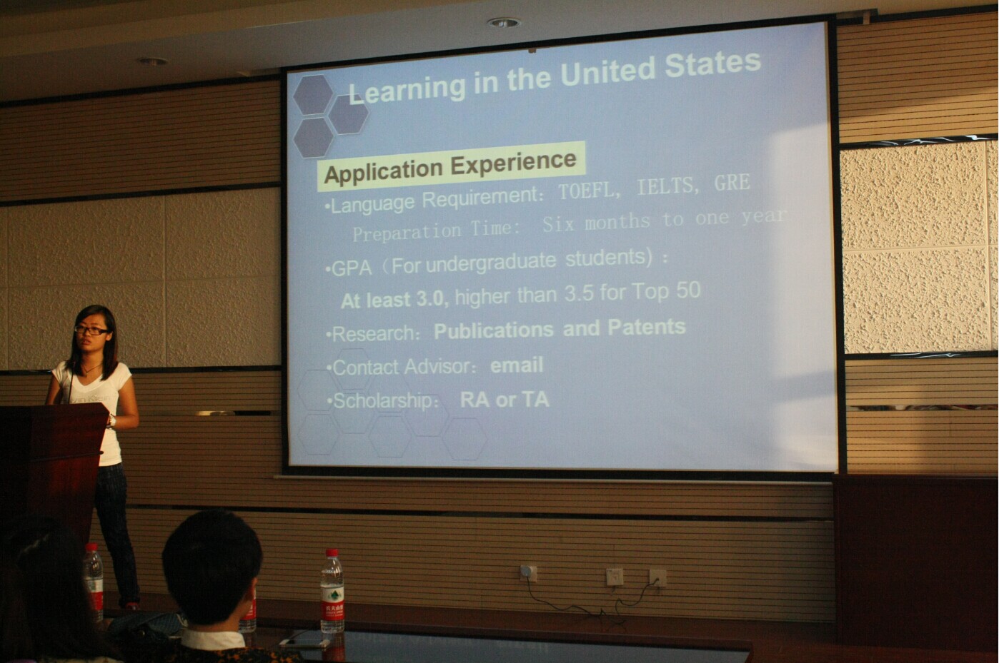 报告中,刘幸蕾同学分别从“Learning in the United States”、“Living in the United States”和“Traveling in the United States”三个方面讲述其申请美国高校全额奖学金、在美求学的艰辛与快乐、在美生活的惬意与充实以及游历美国的乐趣。刘幸蕾同学结合美国高校的奖学金制度,重点介绍了美国大学的学习方式和科研习惯等,她颇有感触地谈到,通过出国留学的历练,自己的专业知识及科研能力都得到了一定程度的提高;培养了积极乐观的心态和全面分析问题、处理问题的能力。刘幸蕾鼓励同学们加强专业学习,努力提高外语水平,抓住机会,勇敢努力地走出去体验多彩的世界。最后她以“总有一天,你会感谢曾经那么努力的你”为结语,勉励同学要脚踏实地、奋力拼搏、争当优秀。