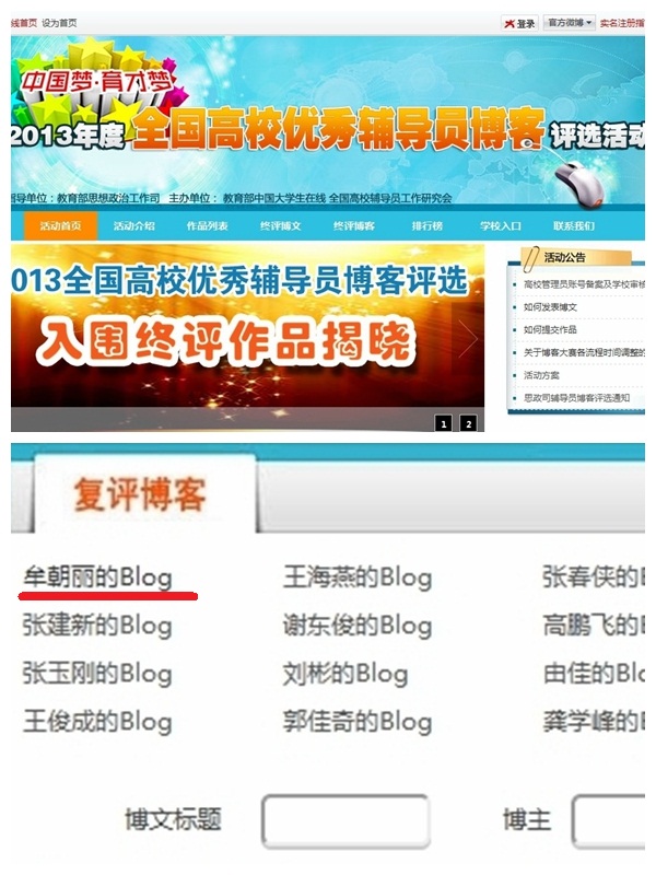 辅导员牟朝丽的博客在此次比赛中成功挺进十佳优秀博客的复评,虽未能最终摘得桂冠,但也获得了专家学者和学生们的广泛好评。牟朝丽老师的博客,从解决学生思想、学习、生活中的问题和困难出发,与学生形成了良好的互动。牟朝丽老师善于把握学生心理特点,敢于创新和实践,通过博客与学生分享自己对辅导员工作的思考,围绕理想信念教育及思想引导、党团建设及班级管理、心理健康与情感励志、就业创业指导与职业规划、学习及学术研究指导、文体活动及课外生活指导等内容,积极与学生分享和交流心得体会,并在博客上开展征文活动,使博客成为学生的精神家园和心灵驿站,开辟了运用新媒体教育学生、引导学生的思想政治教育新途径,深受学生欢迎。