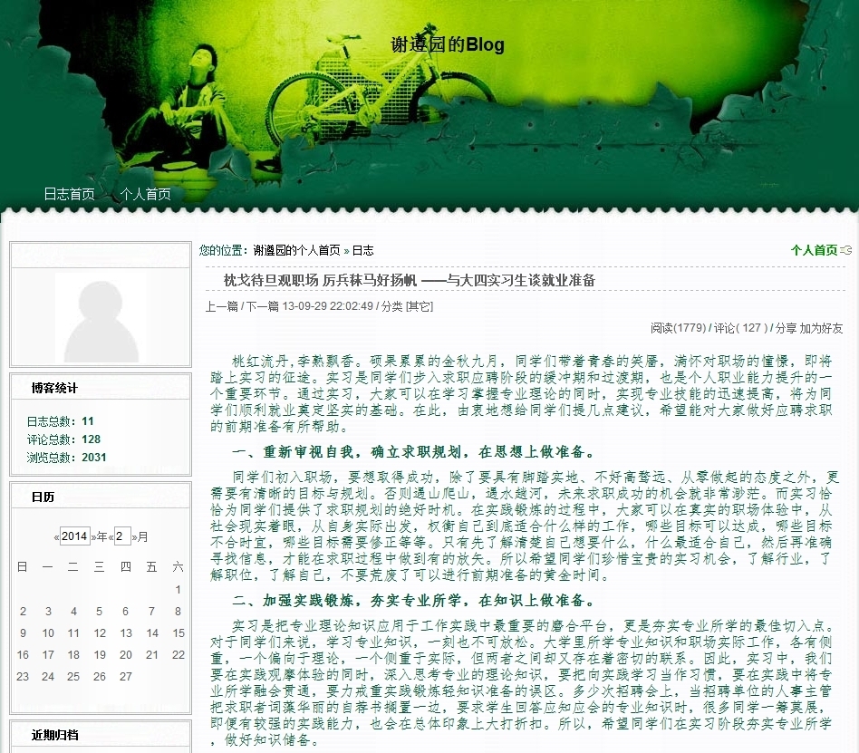 辅导员谢遵园的博客文章《枕戈待旦观职场,厉兵秣马好扬帆——与大四实习生谈就业准备》荣膺百篇优秀博文奖。至此,拉斯维加斯娱乐城官网