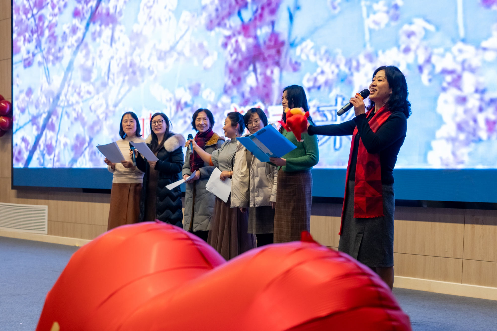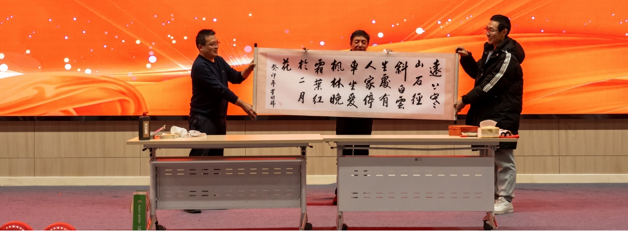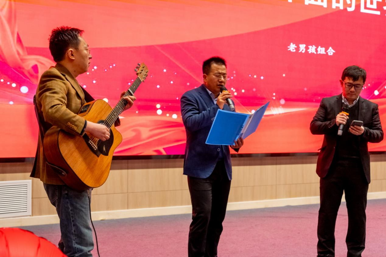 联欢会在悠扬婉转的合唱歌曲《红梅赞》中拉开帷幕。各工会小组的老师们纷纷登台,一展身手。自编自演的三句半《新年新发展》、老中青合唱《骏马奔驰保边疆》、舞蹈《天天向上》、独唱《大约在冬季》、吉他弹唱《大梦+外面的世界》、独唱《滚滚长江东逝水》、小合唱《布谷鸟》、武术表演《中国风》、歌曲串烧《仙儿+绿袖子+情字路上》、独唱《春江花月夜》、书法展示《迎新春》、小合唱《明天会更好》等节目接连上演。现场精彩纷呈,气氛欢快,引来全场阵阵欢呼。