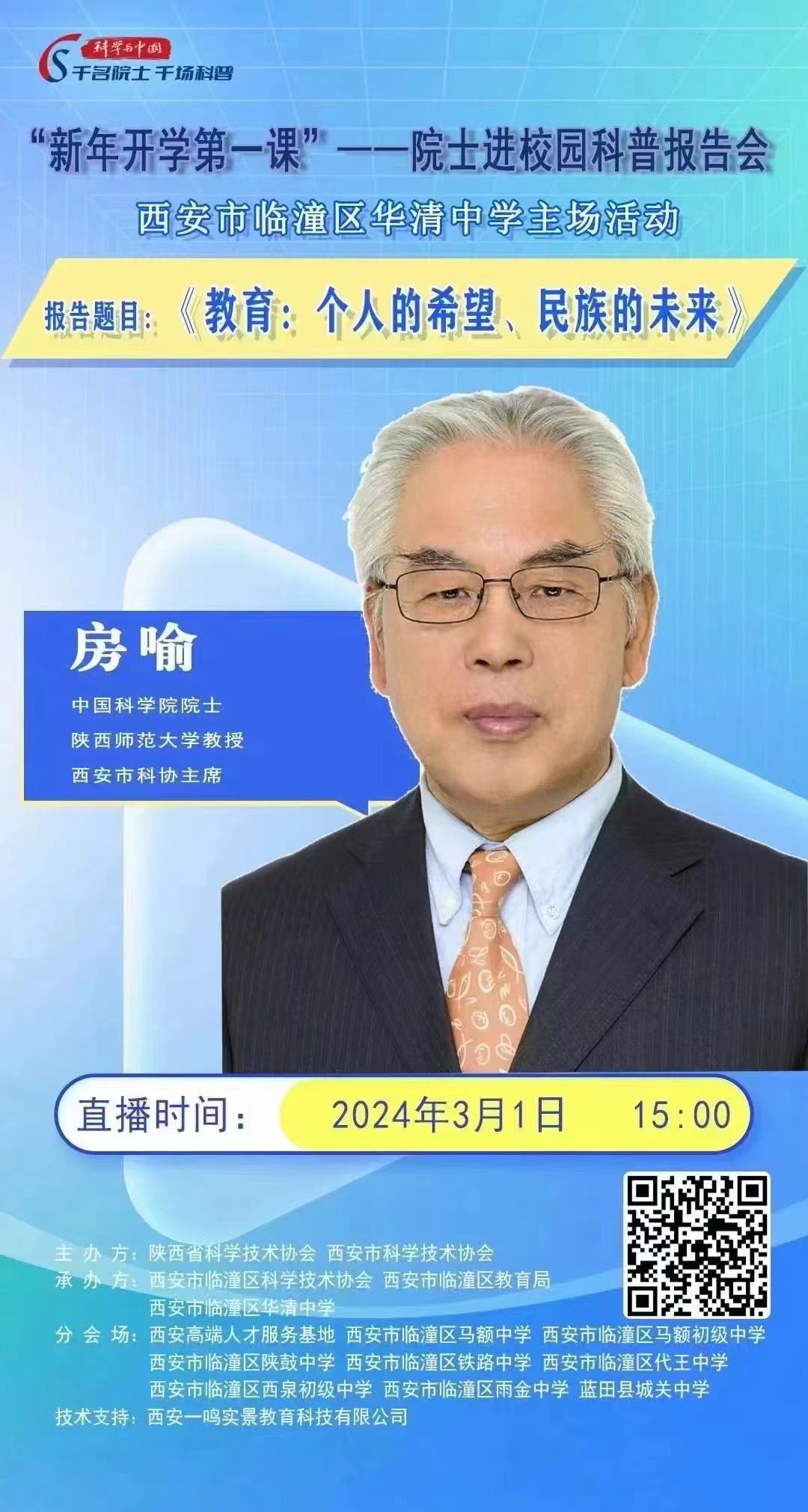 2024年3月1日下午,房喻院士赴西安市临潼区在由陕西省科协、西安市科协主办的院士进校园科普报告会华清中学主场活动上主讲“新年开学第一课”。