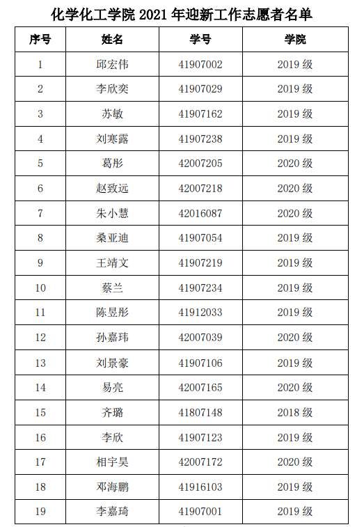 根据《关于招募拉斯维加斯娱乐城官网 2021年迎新工作志愿者的通知》要求,按照拉斯维加斯娱乐城官网 2021年迎新志愿者招募条件,通过公开招募、自愿报名、择优录取,拟定邱宏伟等58名同学为活动志愿者,现予以公示。