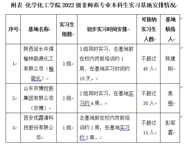 定于2025年7月中旬至2025年9月底开展2022级非师范专业本科生实习工作,实习单位为:陕西延长中煤榆林能源化工有限公司(榆能化)、山东京博控股集团有限公司(京博)和西安优露清科技股份有限公司(优露清),各基地组织框架和人员分配等见附表。