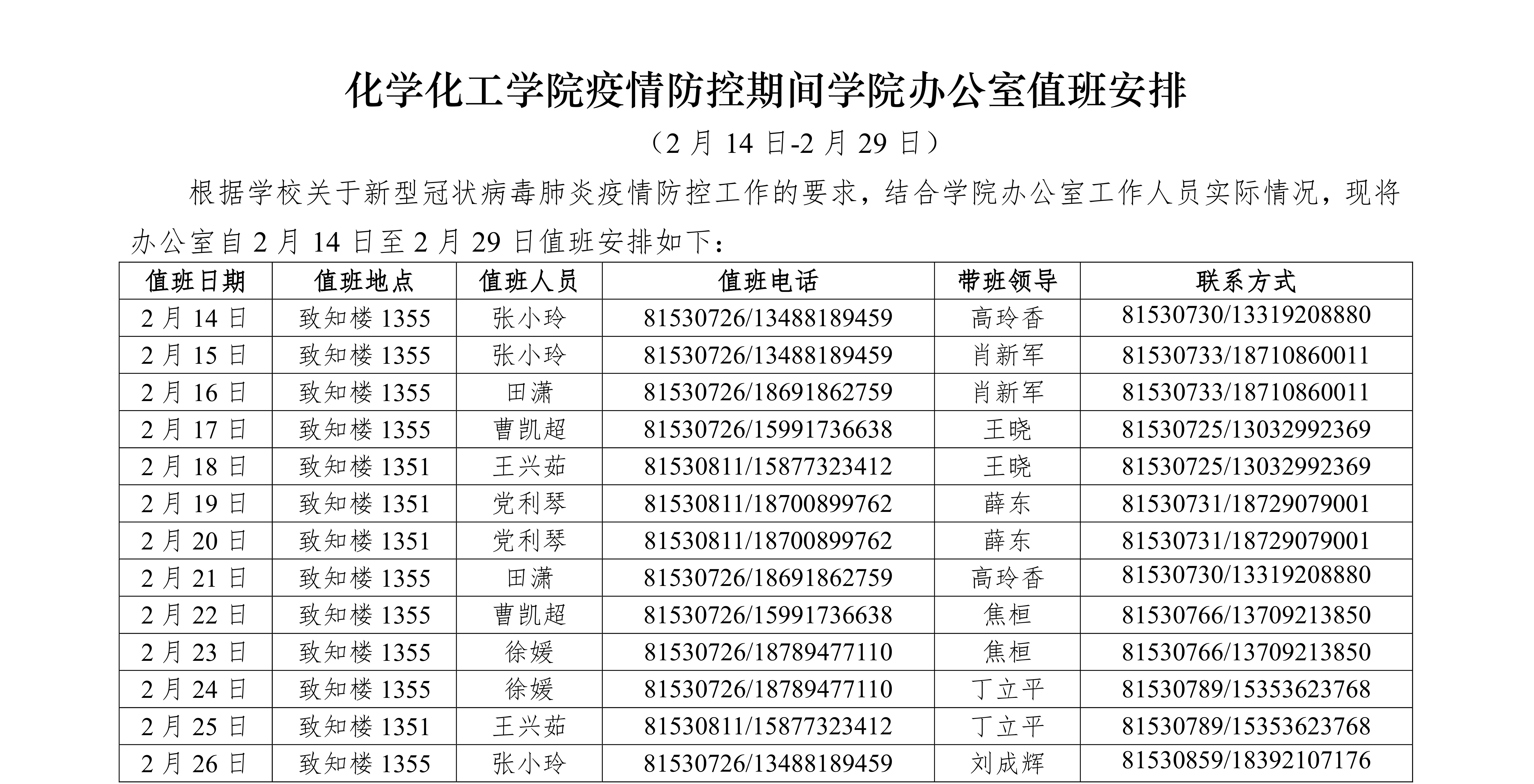 拉斯维加斯娱乐城官网 疫情防控期间拉斯维加斯娱乐城官网 办公室值班安排 (2月14日-2月29日)