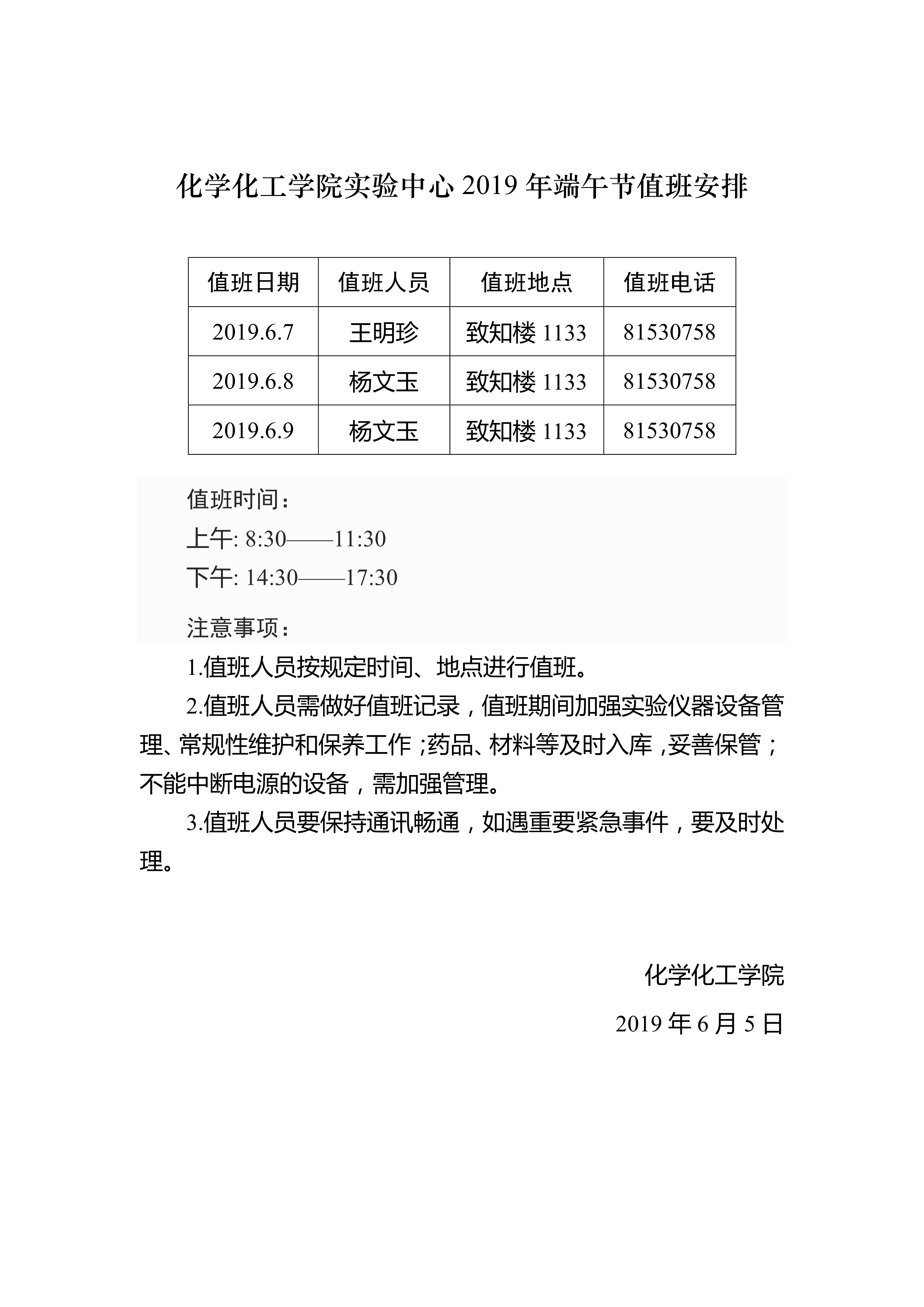 拉斯维加斯娱乐城官网 实验中心2019年端午节值班安排