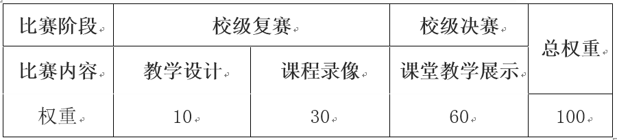 (一)比赛计分。校级比赛分两个阶段进行,参赛教师总得分为各阶段得分加权累计,各阶段分值权重如下。