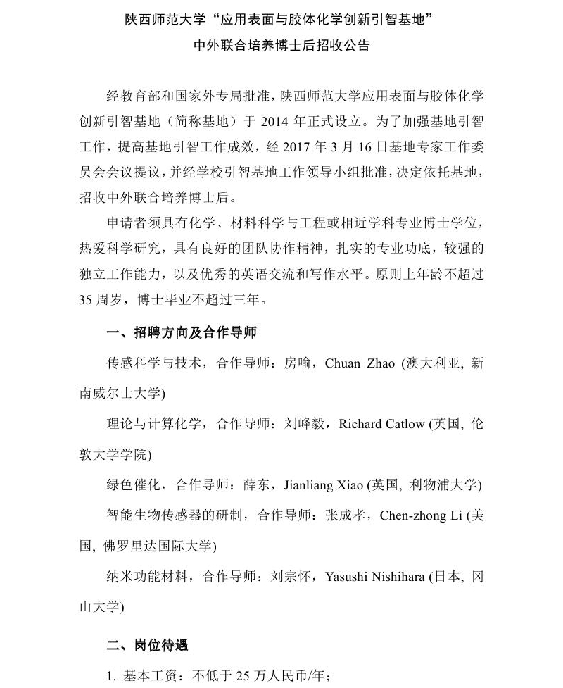 拉斯维加斯娱乐城官网 “应用表面与胶体化学创新引智基地”中外联合培养博士后招收公告