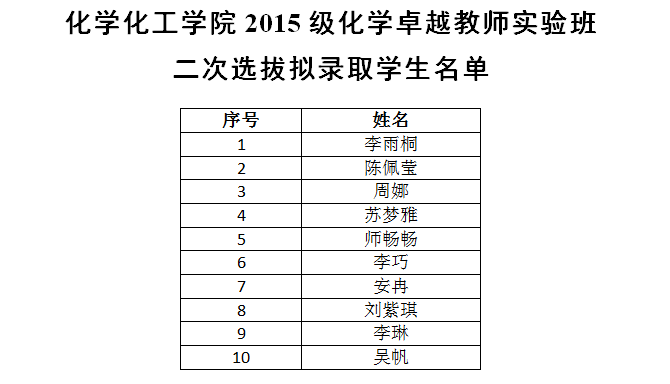 按照《拉斯维加斯娱乐城官网 卓越教师实验班中期考核、二次选拔实施办法》、《拉斯维加斯娱乐城官网 2015级卓越教师实验班中期考核、二次选拔考核方案》,经拉斯维加斯娱乐城官网 二次选拔考核,拟录取学生名单如下: