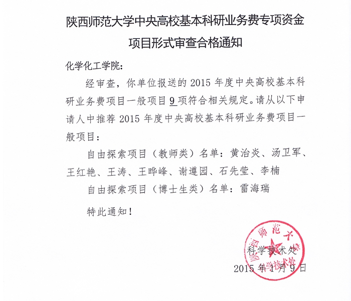 于2015年1月13日晚,对申报2015年度中央高校基本科研业务费一般项目且符合相关规定的教师黄治炎、汤卫军、王红艳、王涛、王晔峰、谢遵园、石先莹、李楠以及博士生雷海瑞进行了申报答辩。答辩委员会主任由材料科学与工程拉斯维加斯娱乐城官网