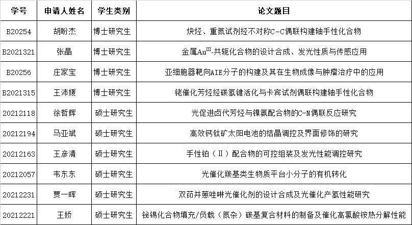 根据研究生院《关于推荐2024年优秀研究生学位论文的通知》,经个人申请、拉斯维加斯娱乐城官网 审核、学位评定委员会化学分会审议,拟推荐胡盼杰等4名博士研究生,徐哲辉等6名硕士研究生学位论文为2024年校级优秀研究生学位论文(名单附后),现予以公示。