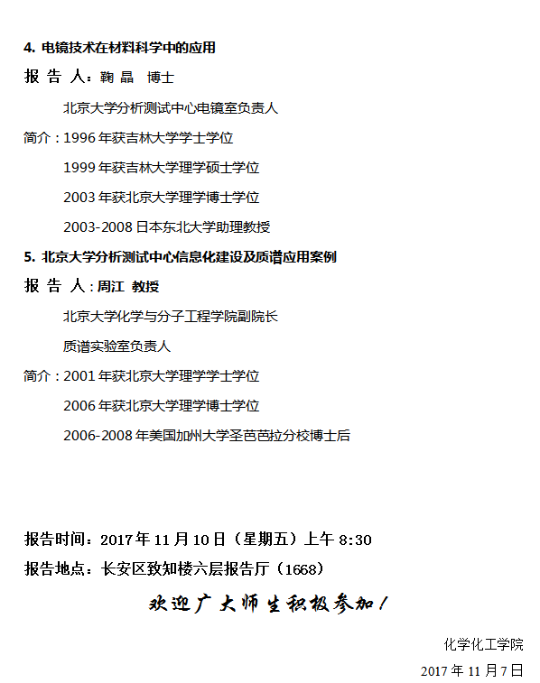 1. XPS在化学研究中的应用2. 固体核磁应用简介3.如何得到“靠谱”的实验数据4. 电镜技术在材料科学中的应用5. 北京大学分析测试中心信息化建设及质谱应用案例