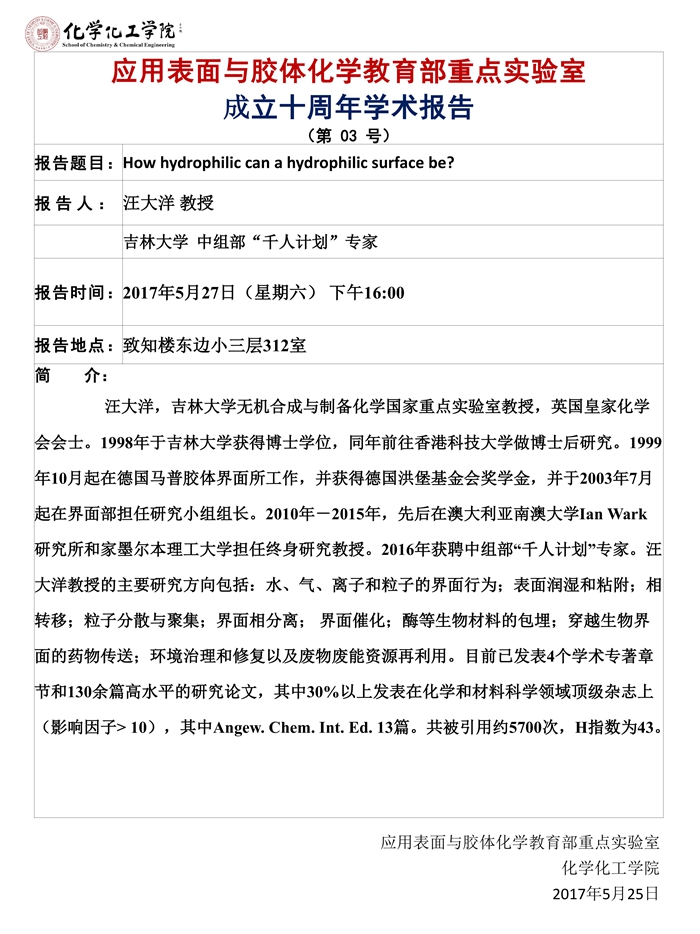 应用表面与胶体化学教育部重点实验室成立十周年学术报告