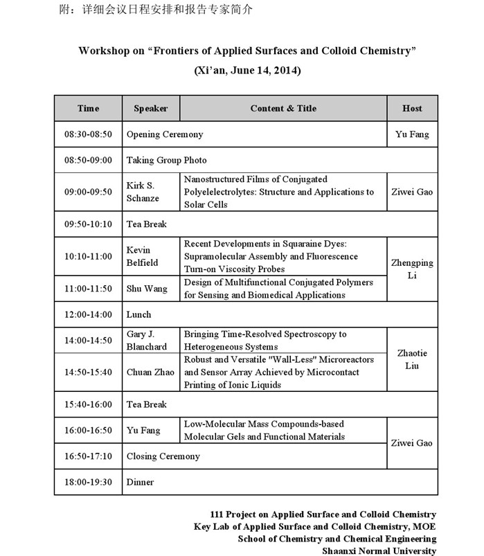 (长安校区)召开。本届会议由应用表面与胶体化学创新引智基地(111计划)资助,邀请到美国密芝根州立大学Gary Blanchard教授、担任ACS Applied Materials & Interface杂志主编的佛罗里达大学Kirk Schanze教授,中佛罗里达大学Kevin Belfield教授、澳大利亚新南威尔士大学Chuan Zhao教授、中国科拉斯维加斯娱乐城官网