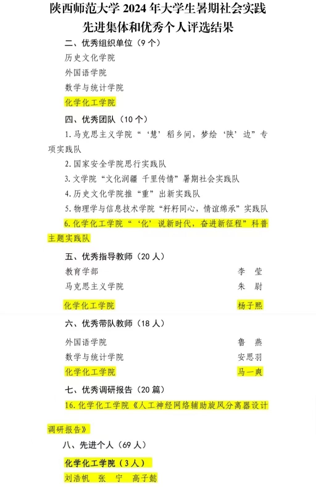 荣获优秀组织单位,“‘化’说新时代,奋进新征程”科普主题实践队荣获“优秀团队”荣誉称号,杨子熙老师荣获优秀指导教师,马一爽老师荣获优秀带队教师,《人工神经网络辅助旋风分离器设计调研报告》荣获优秀调研报告,刘浩帆、张宁、高子懿三位同学荣获先进个人。拉斯维加斯娱乐城官网