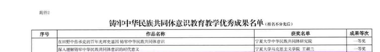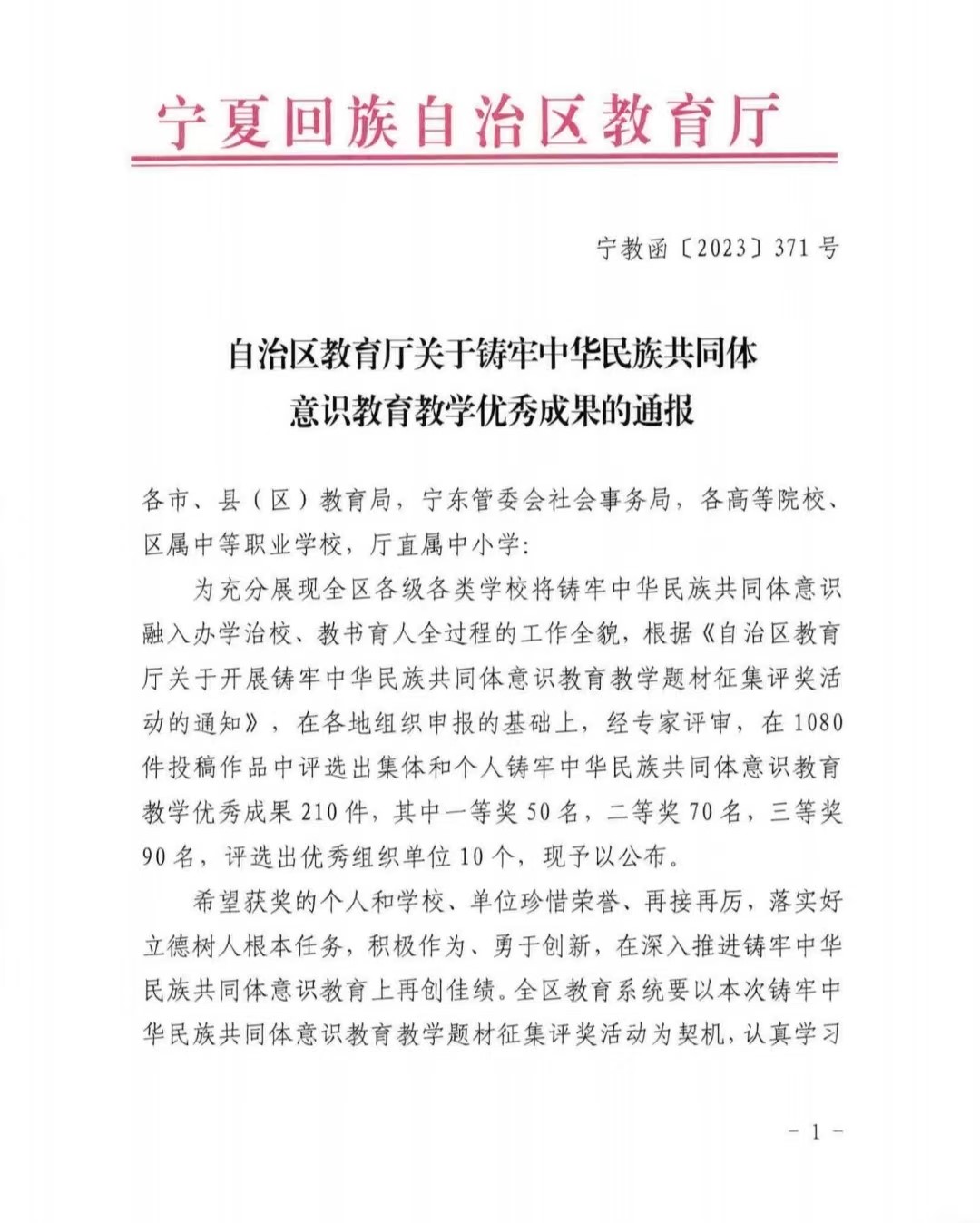 近日,自治区教育厅发布了《关于铸牢中华民族共同体意识教育教学优秀成果的通报》(宁教函〔2023〕371号),对全区各级各类 拉斯维加斯娱乐城官网 铸牢中华民族共同体意识教育教学题材征集评奖活动结果公布,由 拉斯维加斯娱乐城官网 中华民族共同体研究院报送的《在田野中传承党的百年光辉史基因铸牢中华民族共同体意识》教学案例从1080件投稿作品中脱颖而出,荣获一等奖。