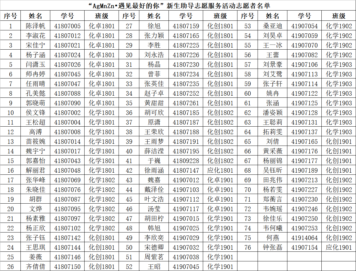 根据《关于公开招募拉斯维加斯娱乐城官网 “AgMnZn•遇见最好的你”新生助导活动志愿者的通知》要求,按照拉斯维加斯娱乐城官网 “AgMnZn·遇见最好的你”新生助导活动志愿者招募条件,通过公开招募、自愿报名、择优录取,拟定陈泽帆等76名同学为活动志愿者,现予以公示。
