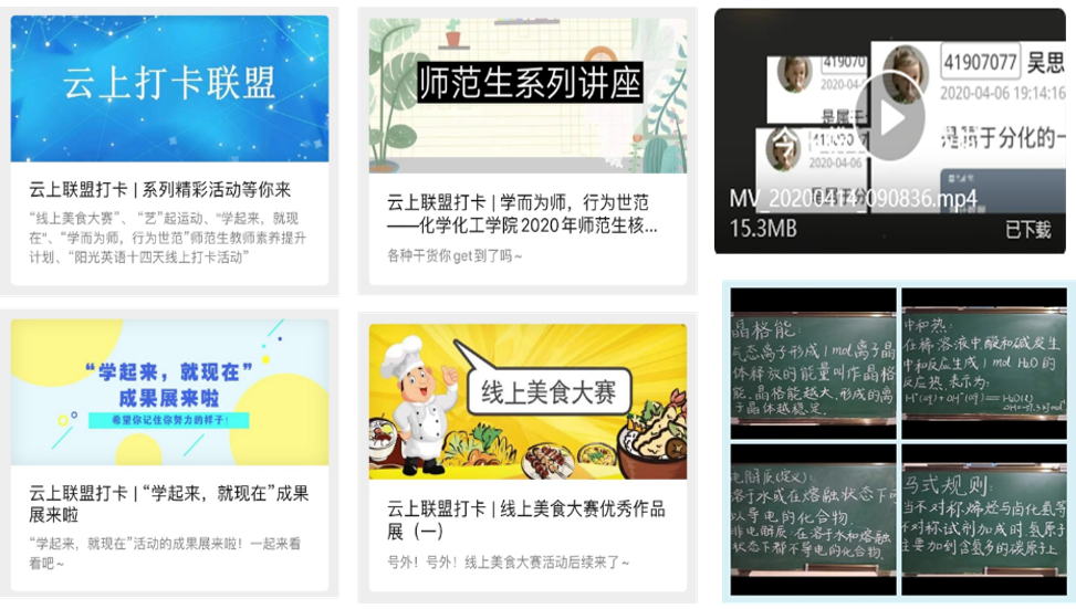 学生会推出云上打卡联盟活动,活动分为五个板块,内容涵盖学习、运动、美食、教师素养经验分享等多个方面,累计打卡1300余次。