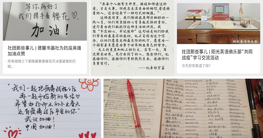 团委坚持指导朝阳理论学习社、绿色环保协会、阳光英语俱乐部等学生社团开展线上学习分享会、“最美人间三月天,学海遨游人不倦”活动、“共同抗疫”学习交流等线上活动,丰富学生的课余生活。