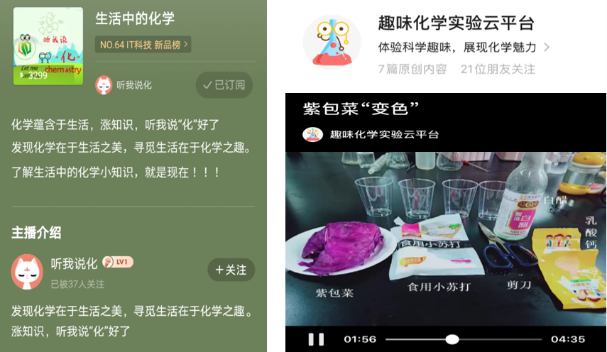 团委积极发挥新媒体宣传优势,通过喜马拉雅音频分享平台开设“听我说化”栏目;指导趣味化学实验团队成员将趣味化学实验内容剪辑成系列公开科普视频,建立了趣味化学实验云平台,不间断传播化学正能量。