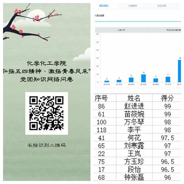 网络问卷答题使用问卷星软件,参赛同学扫描二维码即可进行线上答题。活动期间同学们踊跃参与,取得了不错的成绩。最终共有117名同学进行了答题,平均成绩为81.08分。赵进进等十名答题成绩最优秀的同学获得优秀个人奖。
